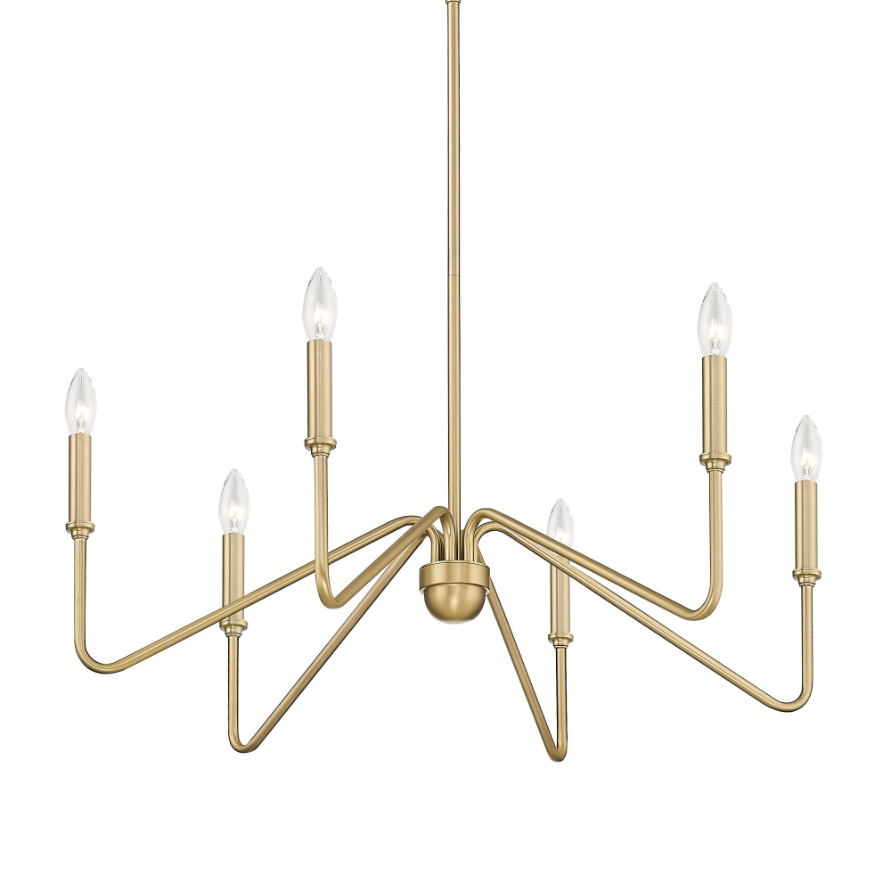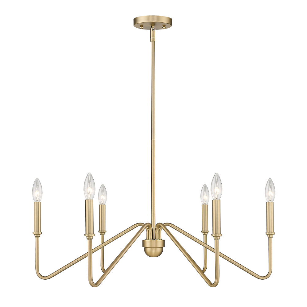 Bring luxurious charm into your home with the Yep by Golden Lighting Kennedy 6-light Chandelier in Brushed Champagne Brass. This stunning chandelier showcases a sleek design that reflects a versatile transitional aesthetic. Its shimmering finish harmonizes the warmth of brass with the softness of silver, creating a chic centerpiece. Ideal for dining rooms, foyers, and living spaces, this dry location rated fixture is perfect for areas where moisture is not a concern. Installation is effortless, with sloped-ceiling compatibility, you can customize the hanging length to fit your arrangement. The chandelier has overall dimensions of 29.75"W x 9.38"H x 29.75"D and requires 6 E12 candelabra base bulbs (not included) with a maximum wattage of 60 each, offering ample illumination. Experience quality craftsmanship and style that enhances your home.
