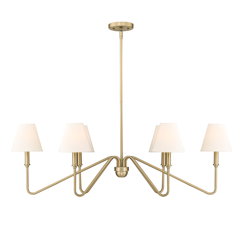Bring chic sophistication into your home with the Yep by Golden Lighting Kennedy 6-light Island Light. Featuring an Ivory Linen shade and a Brushed Champagne Brass frame, it creates a welcoming atmosphere. The Ivory Linen shade diffuses light beautifully, providing a soft and tailored look. This luxurious texture is complemented by the fine weaving of the linen, producing an ambient glow that enhances any decor. The Brushed Champagne Brass finish gives a refined touch, making it perfect for contemporary interiors. Designed specifically for kitchen islands, this fixture is Dry Location Rated, suitable for indoor areas away from moisture. Its adjustable height, ranging from 9.375" to 49.875", allows for flexible installation, even on sloped ceilings. Overall Dimensions: 36.75"W x 9.38"H x 9.38"D. Requires 6 E12 Candelabra base bulbs (not included), max 60 watt per bulb. Enrich your home with quality design and inviting illumination.