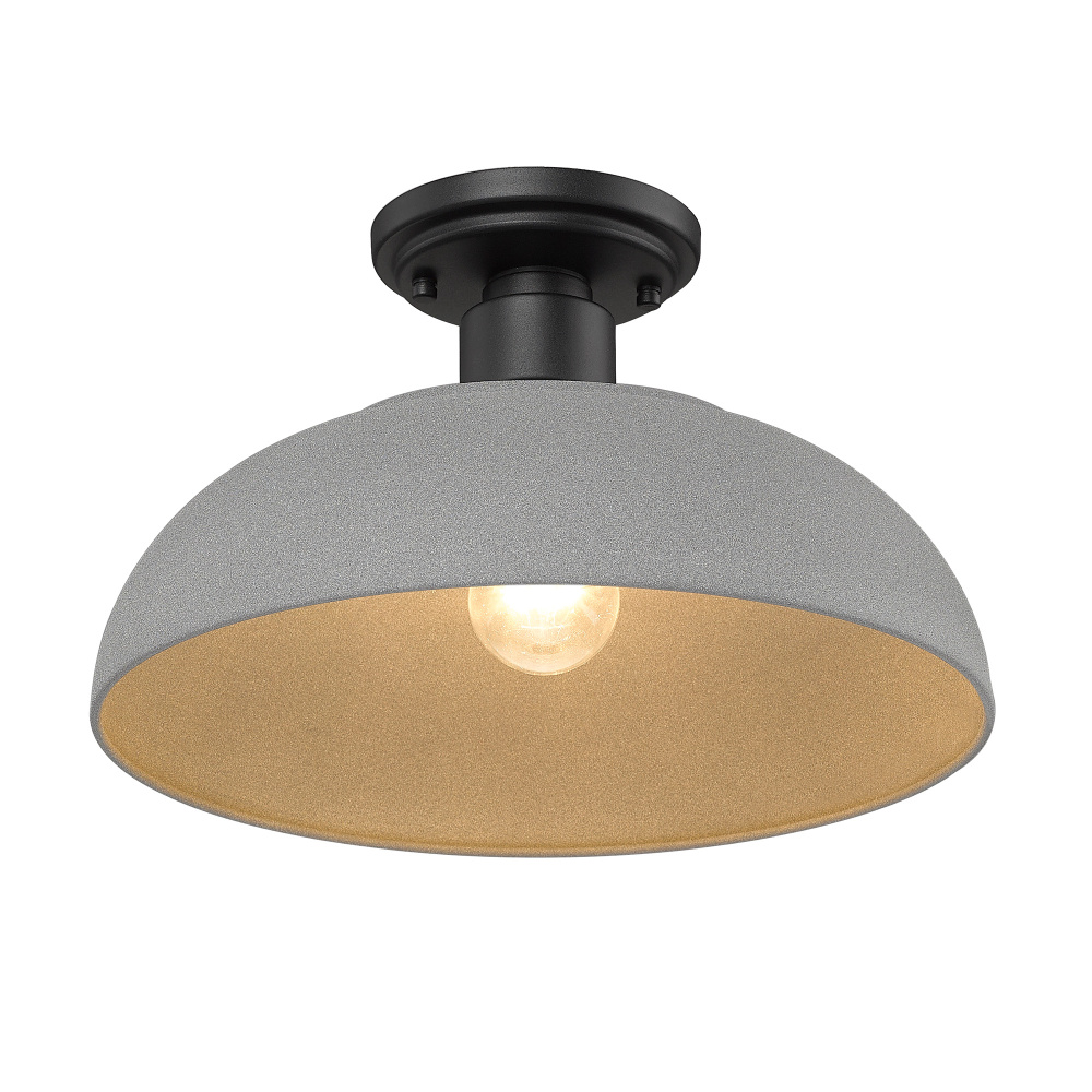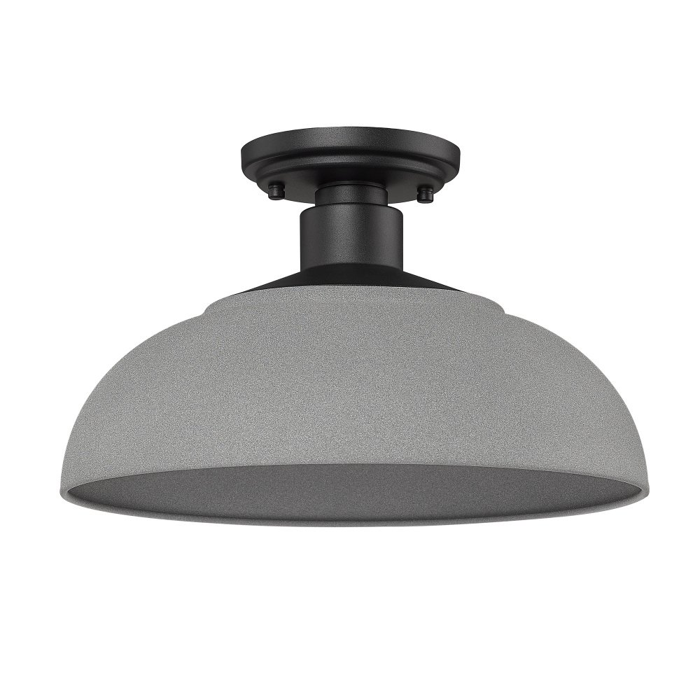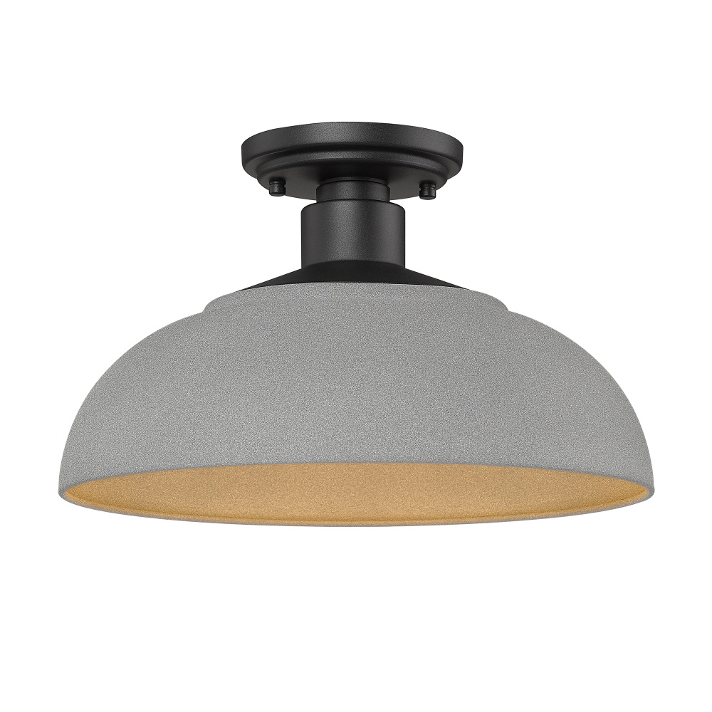 Bring farmhouse elegance into your home with the Yep by Golden Lighting Levitt 1-light Outdoor Ceiling. Featuring a metal shade and a Natural Black frame, it creates a welcoming atmosphere. The metal shade displays a Natural Gray finish with a fine, stone-like texture that embodies a cool, industrial aesthetic. This versatile finish harmonizes beautifully with styles ranging from modern farmhouse to industrial. Designed for overhead coverage for porches, gazebos, or outdoor kitchens, the fixture is Damp Location Rated, making it suitable for covered areas with occasional moisture. Simple installation is required for this fixture, which uses 1 E26 Medium base bulb (not included) with a maximum wattage of 100. Overall dimensions are 13.63"W x 8.25"H x 13.63"D. Experience the timeless character and quality of this classic lighting choice, perfect for enhancing your exterior spaces.