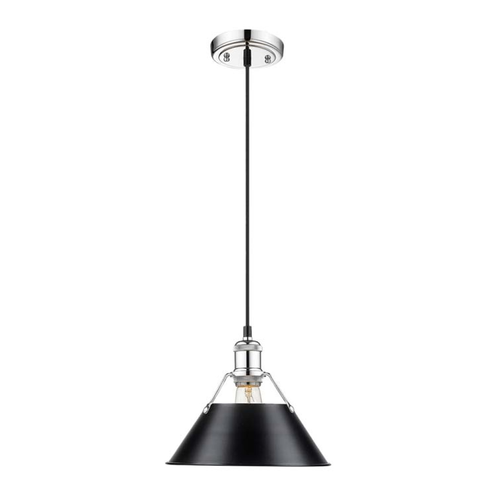 Bring industrial elegance into your home with the Yep by Golden Lighting Orwell 1-light 10in Pendant. Featuring a metal shade and a chrome frame, it creates a welcoming atmosphere. The metal shade showcases a classic Matte Black finish, providing a deep, uniform color that absorbs light for a sophisticated look. Its smooth surface offers understated elegance, making it the perfect fit for minimalist and contemporary decor. Brilliant and timeless, the polished chrome finish adds a touch of brightness and polished perfection to any space. Its highly reflective surface seamlessly integrates into a range of styles, from modern to traditional. Ideal for kitchens, dining rooms, and even bathrooms, this pendant light is damp location rated, suitable for covered and semi-enclosed spaces. Its adjustable height feature allows easy installation on angled ceilings, ensuring customized hanging lengths. Overall Dimensions: 10"W x 8.5"H x 10"D, and it requires 1 E26 Medium base bulb (not included, max 100 wattage per bulb). Experience the blend of style and quality for a truly captivating lighting solution.