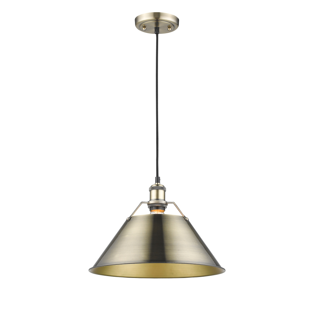 Bring industrial elegance into your home with the Yep by Golden Lighting Orwell 1-light 14in Pendant. Featuring a metal shade and an aged brass frame, it creates a welcoming atmosphere. The metal shade allows for upward light escape, providing ambient lighting that fills the room beautifully. The Aged Brass finish exudes timeless elegance, enriching your décor with warm undertones that resemble vintage heirlooms. Our Aged Brass finish offers a warm, inviting glow, created through a durable electroplating process. The finely-spun circular brushing adds a tactile surface and subtle antiquing, perfect for traditional and transitional spaces. Add a stylish statement to kitchens, dining rooms, or bedrooms—this fixture is Damp Location Rated, making it suitable for covered spaces with occasional moisture. Sloped-ceiling compatible and adjustable in height, it accommodates various installations. Requires 1 E26 Medium base bulb (not included), with a maximum wattage of 100. Overall Dimensions: 14"W x 10"H x 14"D. Enjoy quality craftsmanship and elevated style, making your space inviting and inspiring.