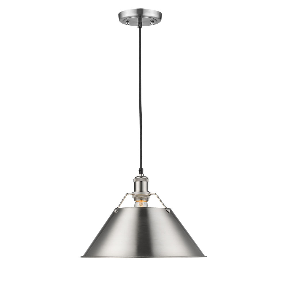 Bring industrial elegance into your home with the Yep by Golden Lighting Orwell 1-light 14in Pendant. Featuring a metal shade and a pewter frame, it creates a welcoming atmosphere. The pewter shade, with its medium-toned, warm silver-grey color and uniform satin lustre, gently diffuses light to create an elegant and non-glare environment. Our pewter finish offers a timeless appeal, perfect for both classic and contemporary interiors. Designed for versatility, it's damp location rated, making it suitable for covered and semi-enclosed spaces, such as bathrooms and porches. Installation is easy with its sloped-ceiling compatibility, and you can customize the hanging length, adjustable from 17.5" to 131.5". Overall dimensions measure 14"W x 10"H x 14"D, requiring 1 E26 medium base bulb (not included) with a maximum wattage of 100. This pendant is not just lighting, it's a stylish statement that embodies quality and sophistication.