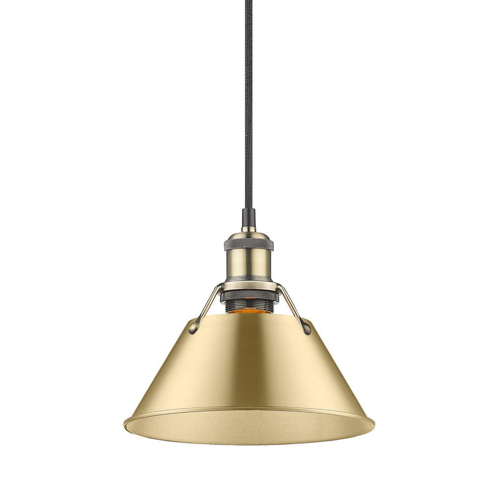 Bring industrial elegance into your home with the Yep by Golden Lighting Orwell 1-light 8in Pendant. Featuring a metal shade and an aged brass frame, it creates a welcoming atmosphere. The metal shade features a Brushed Champagne Brass finish, offering a pale, muted brassy-gold color with a soft satin luster for a sophisticated look. Embrace timeless elegance with our Aged Brass finish, offering a warm, inviting glow reminiscent of vintage heirlooms. Add a stylish statement to kitchens, dining rooms, or bedrooms—perfect for focused yet decorative illumination in entryways and bathrooms. Damp Location Rated: Suitable for covered and semi-enclosed spaces. Easily install on sloped ceilings and customize the hanging length to suit your space, with an adjustable height between 15" and 129". Overall Dimensions: 7.5"W x 7.5"H x 7.5"D. Requires 1 E26 medium base bulb (not included), max 100 watts. Illuminate your home with this quality fixture from Yep by Golden Lighting, adding a touch of understated luxury and character wherever you need it.
