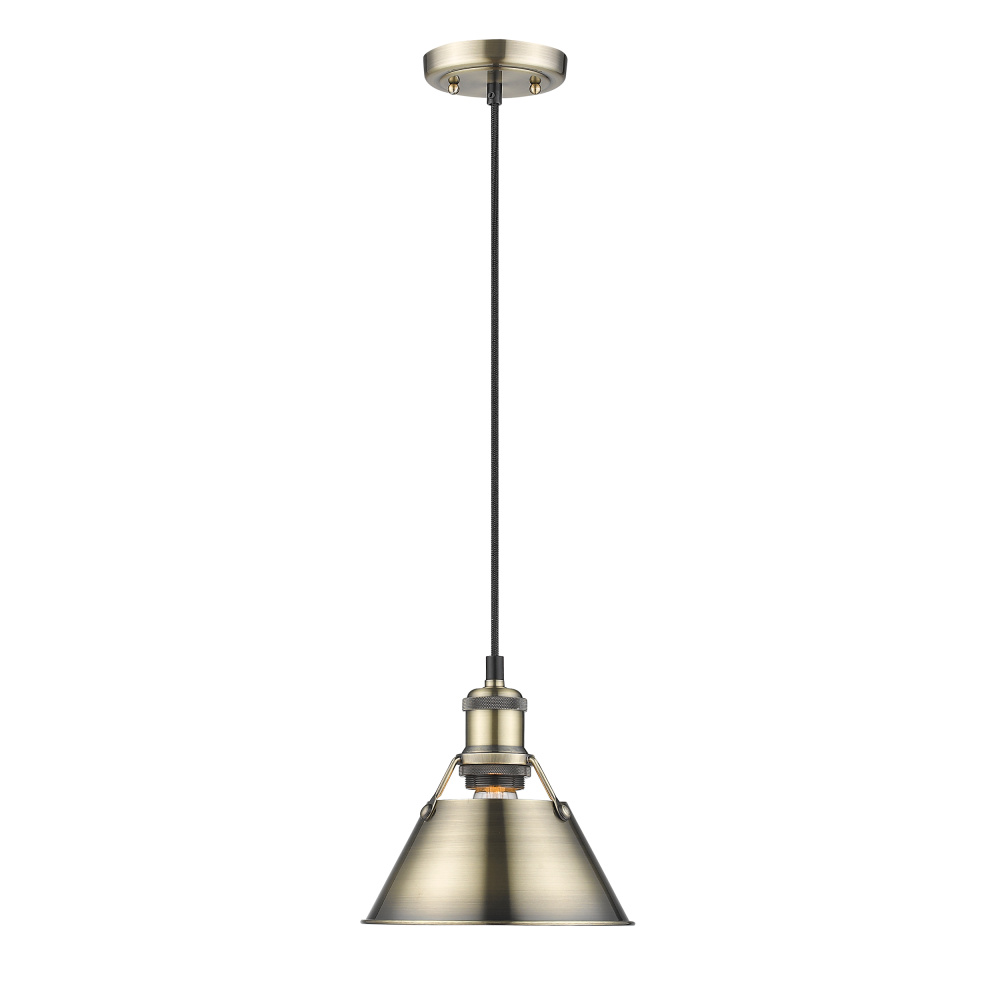 Bring industrial elegance into your home with the Yep by Golden Lighting Orwell 1-light 8in Pendant. Featuring a metal shade and an aged brass frame, it creates a welcoming atmosphere. The aged brass shade delivers a warm glow with a low-luster sheen, providing depth and character through its finely brushed texture. Its timeless design captures the essence of classic hardware with a contemporary twist. This pendant light is a stylish addition to kitchens, dining rooms, or bedrooms, with a damp location rating suitable for covered porches and laundry rooms. The sloped ceiling-compatible design makes installation easy while allowing for adjustable heights from 15" to 129". Overall dimensions are 7.5"W x 7.5"H x 7.5"D, and it requires 1 E26 medium base bulb (not included), max 100 watts. Elevate your home's decor with this elegant pendant, reflecting exceptional craftsmanship and quality.