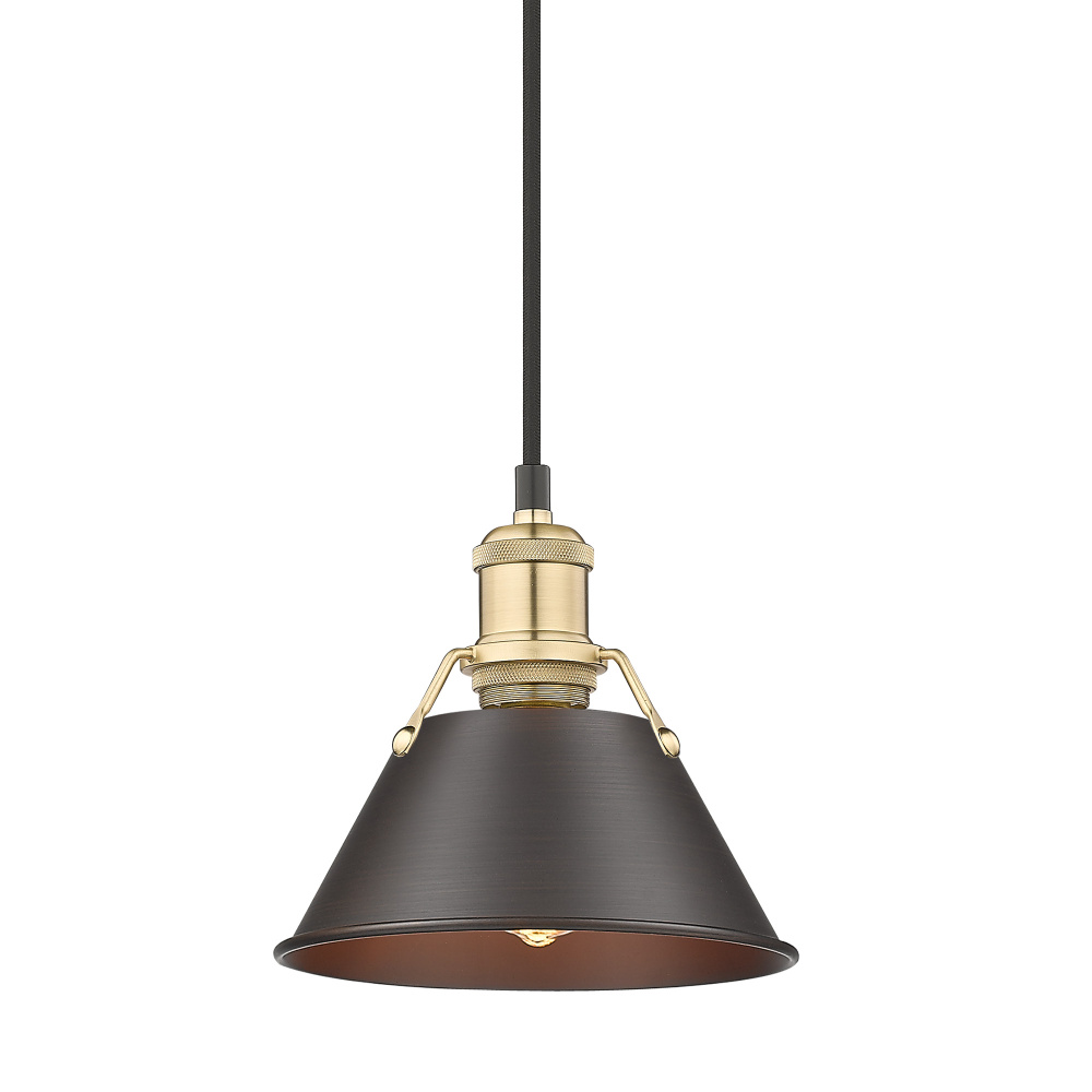 Bring industrial elegance into your home with the Yep by Golden Lighting Orwell 1-light 8in Pendant. Featuring a metal shade and a brushed champagne brass frame, it creates a welcoming atmosphere. The rubbed bronze metal shade, characterized by rich dark brown color and subtle, warm coppery highlights, provides an inviting glow. The brushed champagne brass finish offers a refined texture and soft satin sheen that embraces quiet luxury and contemporary style. Ideal for kitchens, dining rooms, or bedrooms, this pendant light has a damp location rating, making it suitable for covered and semi-enclosed areas. It is sloped-ceiling compatible and adjustable in height from 15" to 129", ensuring a perfect fit in any setting. With overall dimensions of 7.5"W x 7.5"H x 7.5"D, it requires one E26 medium base bulb (not included), with a maximum wattage of 100. The Orwell pendant light represents both function and style, encapsulating the raw aesthetic of early 20th-century factories with modern versatility and quality.