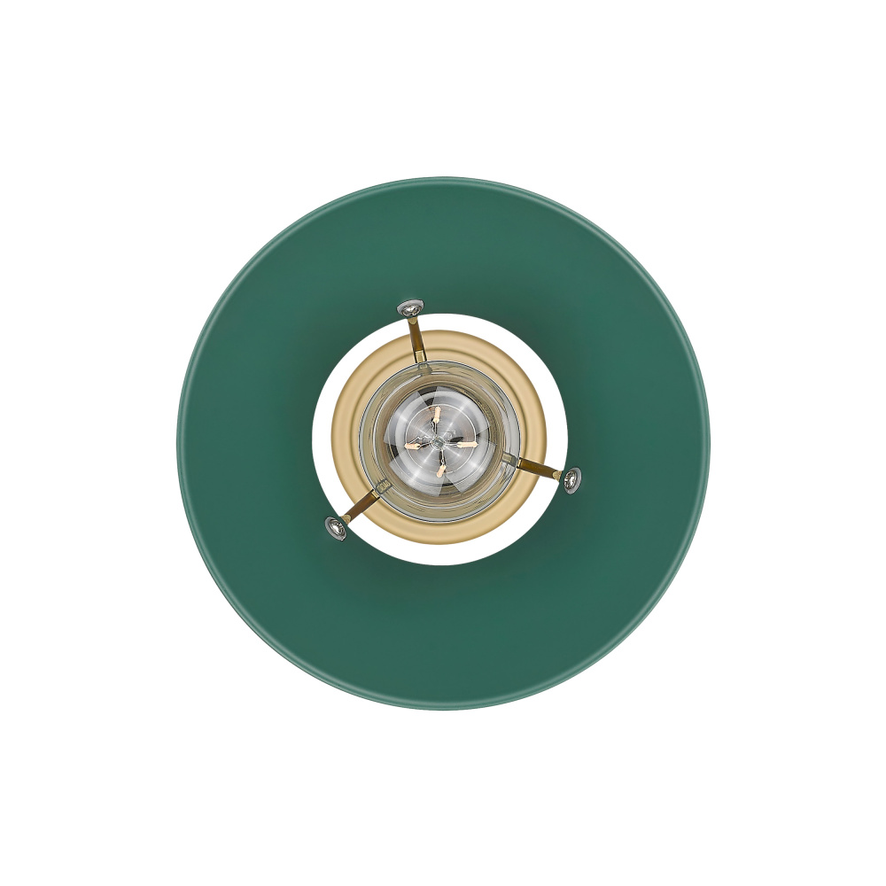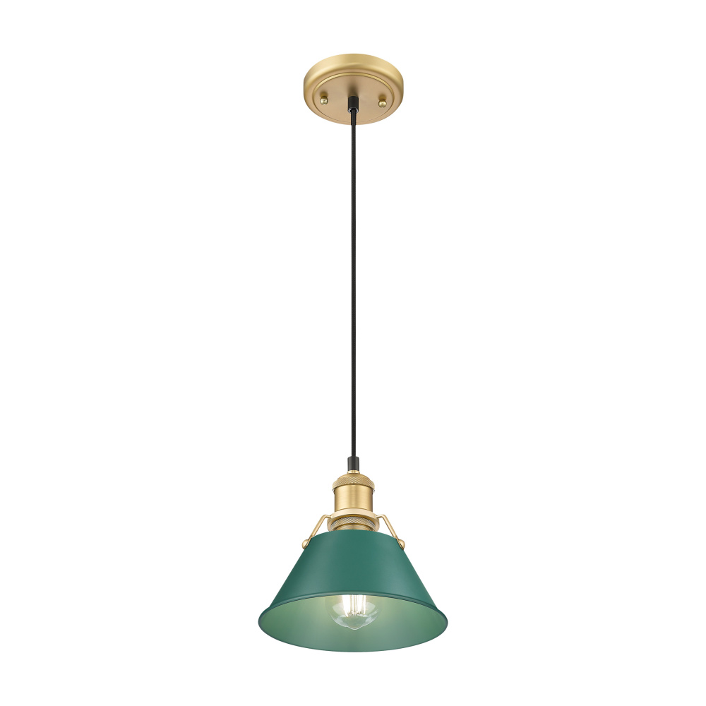 Bring industrial elegance into your home with the Yep by Golden Lighting Orwell 1-light 8in Pendant. Featuring a metal shade and a brushed champagne brass frame, it creates a welcoming atmosphere. The Pine Green metal shade offers a deep, rich color with a velvety surface that beautifully absorbs light while providing a soft, non-reflective glow. The brushed champagne brass finish pairs sophistication with understated luxury, enhancing any decor. Perfect for covered and semi-enclosed spaces, this pendant is rated for damp locations, making it ideal for bathrooms and kitchens. Easy to install on sloped ceilings with its adjustable height from 15" to 129", it fits seamlessly into your space. Overall dimensions of 7.5"W x 7.5"H x 7.5"D house a single E26 medium base bulb (not included), allowing for a maximum of 100 watts. Transform your interior with this stylish fixture that combines classic and contemporary design.