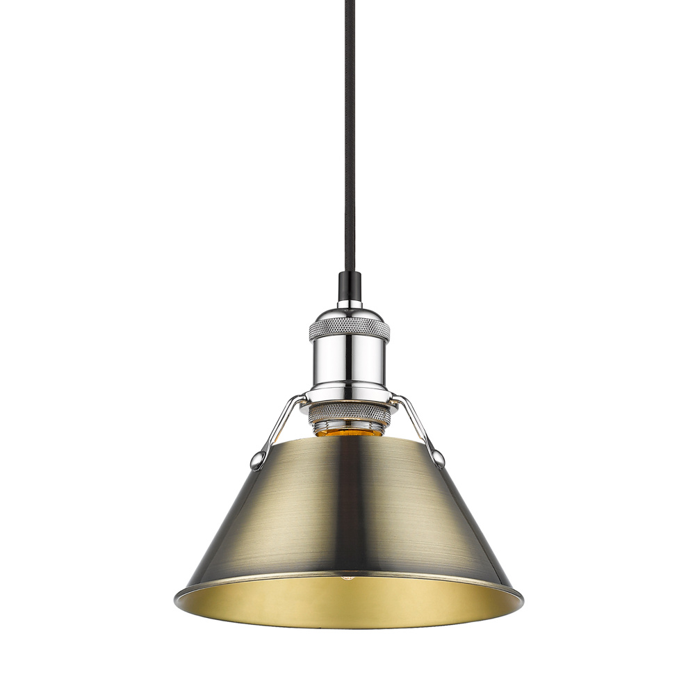 Bring industrial elegance into your home with the Yep by Golden Lighting Orwell 1-light 8in Pendant. Featuring a metal shade and a chrome frame, it creates a welcoming atmosphere. The metal shade, finished in Aged Brass, radiates warmth and vintage charm, enhancing your decor. The polished chrome finish adds a bright, reflective sheen that elevates any space with its timeless aesthetic, making it ideal for both modern and traditional settings. This pendant is suitable for kitchens, dining rooms, and covered outdoor spaces, as it is damp location rated. It's designed for easy installation with sloped-ceiling compatibility and adjustable height from 15" to 129". It measures 7.5"W x 7.5"H x 7.5"D and requires one E26 Medium base bulb (not included) to illuminate your space. Experience sophistication and style with this exquisite fixture.