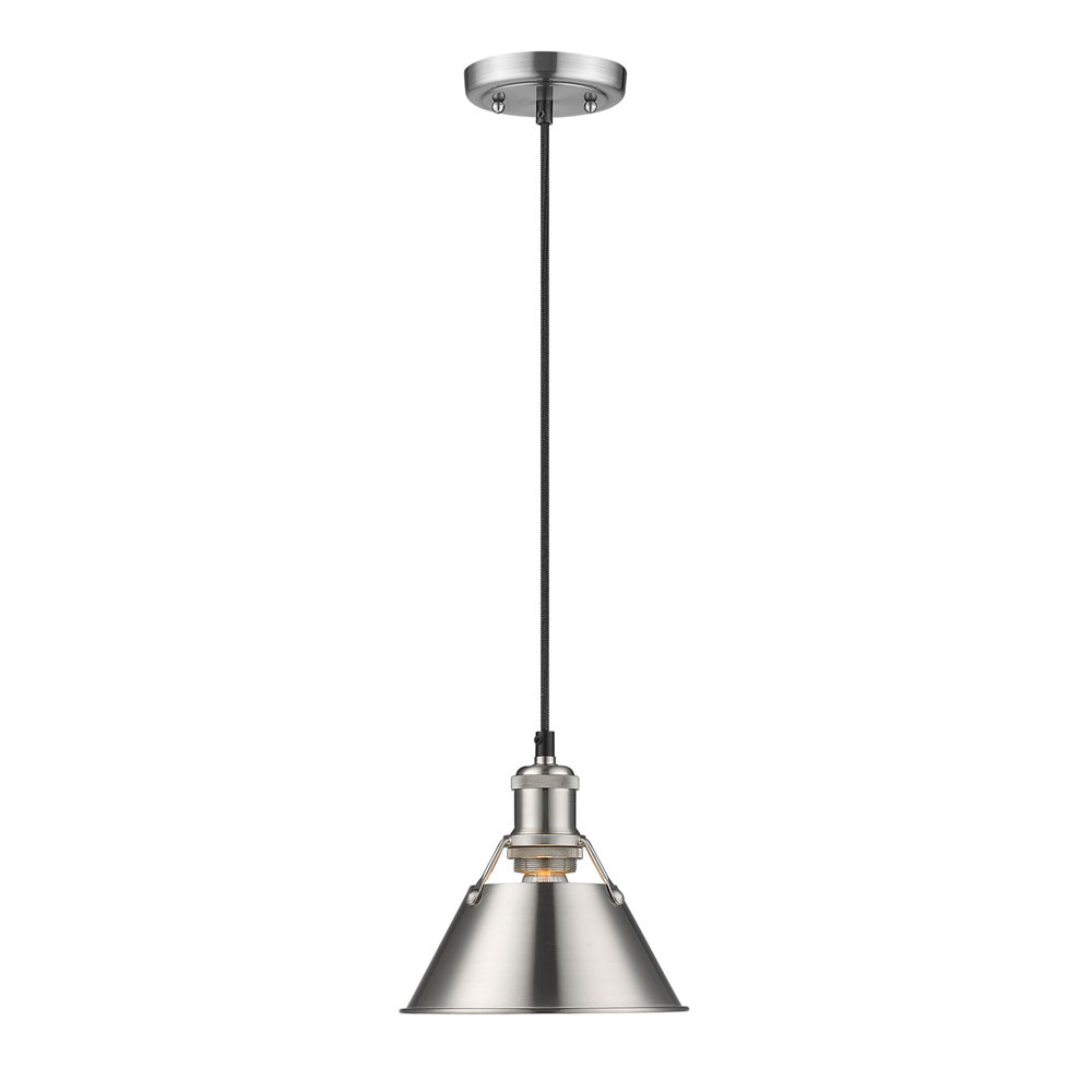 Bring industrial elegance into your home with the Yep by Golden Lighting Orwell 1-light 8in Pendant. Featuring a metal shade and a pewter frame, it creates a welcoming atmosphere. The metal shade showcases a warm silver-grey finish with a brushed texture, providing a subtle and timeless light effect that complements both modern and traditional styles. Our Pewter finish offers a soft and classic alternative to brighter silver tones. With its medium-grey hue and subtle warmth, it’s a versatile choice that adds traditional charm to both classic and contemporary interiors. This stylish pendant is perfect for kitchens, dining rooms, or bedrooms and is damp location rated, ideal for use in covered spaces. Installation is easy with sloped ceiling compatibility, and you can adjust the height from 15" to 129" to fit perfectly. Overall Dimensions: 7.5"W x 7.5"H x 7.5"D. Requires 1 E26 Medium base bulb (not included) with a maximum wattage of 100. Elevate your home’s design with the simple elegance of the Yep by Golden Lighting Orwell Pendant, perfect for bringing focused light and style to any space.
