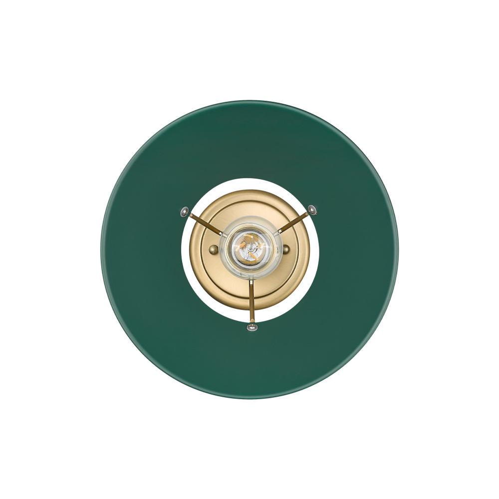 Bring industrial elegance into your home with the Yep by Golden Lighting Orwell 1-light Flush Mount. Featuring a metal shade and a brushed champagne brass frame, it creates a welcoming atmosphere. The metal shade in Pine Green showcases a deep, rich color, inspired by the soothing tones of a forest canopy, with a smooth, non-reflective surface that beautifully absorbs light. The brushed champagne brass finish offers a modern sophistication, blending the warmth of brass with the softness of silver, making this piece a versatile addition to any decor. Ideal for low ceilings in hallways, closets, laundry areas, and bathrooms, this fixture is damp location rated, suitable for covered and semi-enclosed spaces with occasional moisture. Overall Dimensions: 10"W x 8"H x 10"D. Requires 1 E26 Medium base bulb (not included), max 100 watts. Add a touch of quiet luxury and contemporary style to your home with this elegant flush mount fixture, crafted for both beauty and functionality.