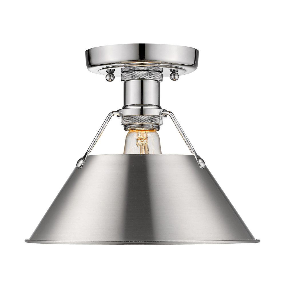 Bring industrial elegance into your home with the Yep by Golden Lighting Orwell 1-light Flush Mount. Featuring a pewter shade and a chrome frame, it creates a welcoming atmosphere. The elegant pewter shade features a soft satin lustre that gently diffuses light, creating an understated yet sophisticated glow suitable for any modern or traditional decor. Brilliant and timeless, the polished chrome finish offers a crisp, clean look with a highly reflective surface that elevates any space. Ideal for low ceilings in hallways, closets, laundry areas, bathrooms, and more, its damp location rating ensures suitability for covered and semi-enclosed spaces with occasional moisture. Overall Dimensions: 10"W x 8"H x 10"D. This fixture requires 1 E26 Medium base bulb (not included), with a maximum wattage of 100. Elevate your home with a stylish, high-quality fixture that perfectly combines aesthetics and functionality.