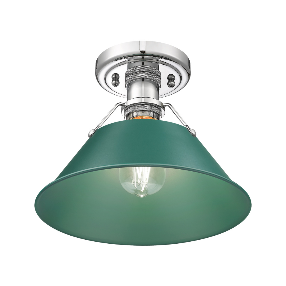 Bring industrial elegance into your home with the Yep by Golden Lighting Orwell 1-light Flush Mount. Featuring a Metal shade and a Chrome frame, it creates a welcoming atmosphere. The Pine Green finish on the metal shade offers a rich, calming color with a velvety low-lustre surface that absorbs light beautifully, adding a refined touch to your space. The brilliant and timeless Polished Chrome finish delivers a crisp, clean look that elevates any decor style and is easy to maintain. Ideal for low ceilings in hallways, closets, laundry areas, bathrooms, and more, this fixture is Damp Location Rated, making it suitable for covered and semi-enclosed spaces with occasional moisture. It requires 1 E26 Medium base bulb, max 100 wattage (not included), and measures overall 10"W x 8"H x 10"D. Elevate your interiors with this quality fixture that blends functionality and style.