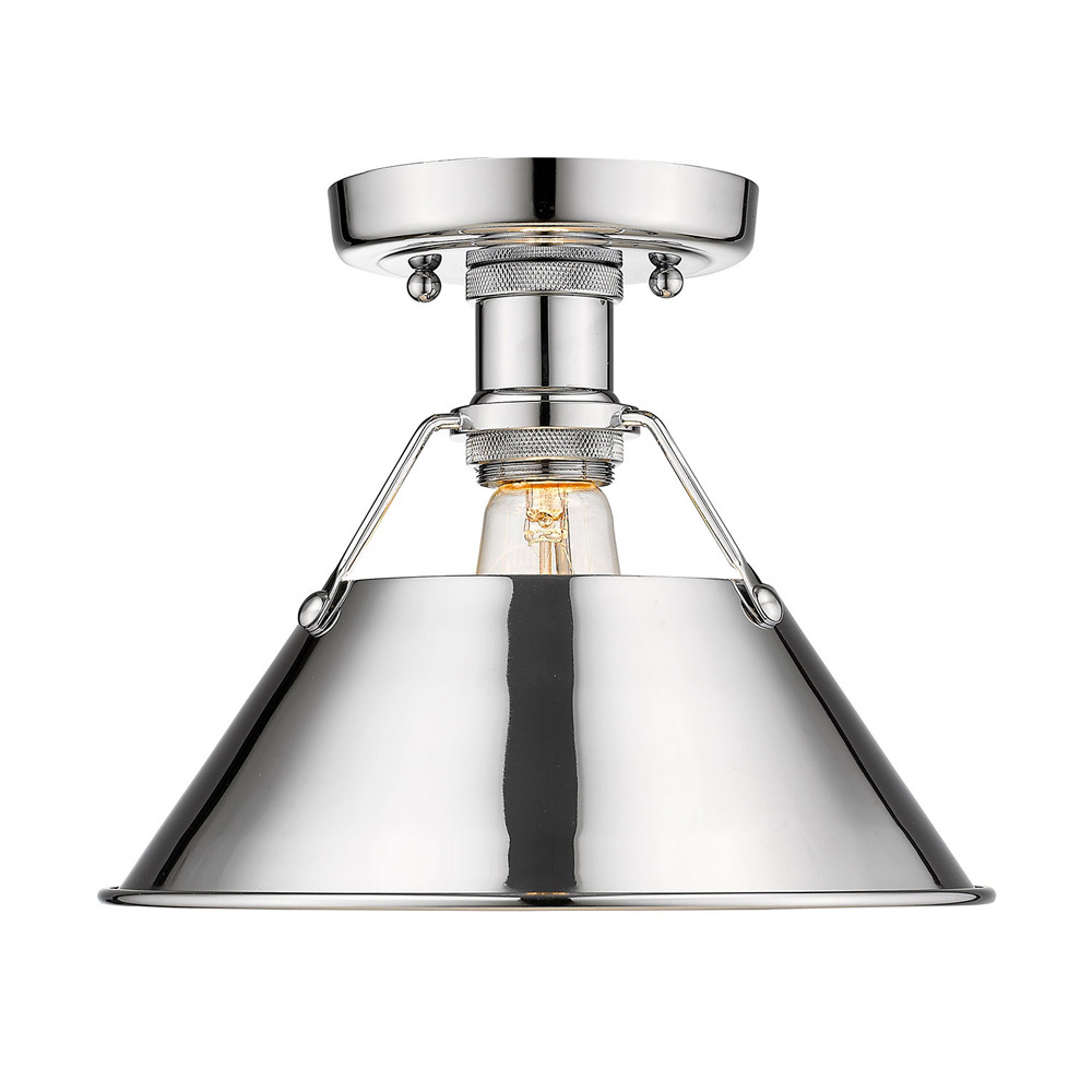 Bring industrial elegance into your home with the Yep by Golden Lighting Orwell 1-light Flush Mount. Featuring a Metal shade and a Chrome frame, it creates a welcoming atmosphere. The durable Metal shade has a highly reflective, mirror-like quality that allows for brilliant light diffusion. Brilliant and timeless, our Polished Chrome finish offers a crisp, clean look that elevates any space. Ideal for low ceilings in hallways, closets, laundry areas, and bathrooms, this fixture is Damp Location Rated for moisture-prone areas. Overall Dimensions: 10"W x 8"H x 10"D. Requires 1 E26 Medium base bulb (not included) with a maximum wattage of 100. Experience the perfect blend of style and functionality with this exquisite fixture, an ideal choice to enhance your modern decor.
