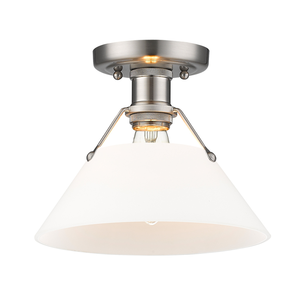 Bring industrial elegance into your home with the Yep by Golden Lighting Orwell 1-light Flush Mount. Featuring an opal glass shade and a pewter frame, it creates a welcoming atmosphere. The opal glass shade features a milky, translucent white color with a satin-matte finish, expertly crafted to diffuse light evenly for a soft, glare-free glow. This timeless design adds a touch of sophistication to any room, ensuring a cozy ambiance. Our pewter finish offers a soft and classic alternative to brighter silver tones, with a subtle warmth that makes it a beautiful fit for both traditional and modern interiors. Ideal for low ceilings in hallways, closets, laundry areas, and bathrooms, this fixture is damp location rated, making it suitable for areas with occasional moisture. Requires 1 E26 Medium base bulb (not included), max 100 watts. Overall dimensions are 10"W x 8"H x 10"D, providing wide illumination in a compact design. Transform your space with a flush mount that embodies quality and timeless style, a perfect choice for those who appreciate both elegance and practical functionality.