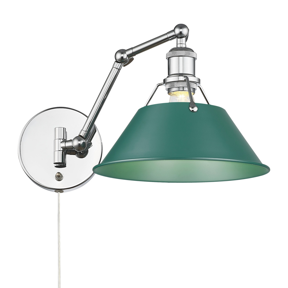 Bring industrial elegance into your home with the Yep by Golden Lighting Orwell 1-light Swing Arm Wall Lamp. Featuring a metal shade and a chrome frame, it creates a welcoming atmosphere. The metal shade features a rich Pine Green finish that beautifully absorbs light, adding a refined pop of color to your space. Its smooth, velvety texture offers elegance while showcasing the sophistication of the hue. The brilliant and timeless polished chrome finish presents a crisp, clean look that elevates any design, seamlessly integrating into various decor styles from classic traditional to ultra-modern. This highly reflective surface is easy to clean, adding a touch of brightness to your home. Ideal for bedrooms and home offices, this lamp is damp rated, making it suitable for covered areas with occasional moisture, like porches or laundry rooms. The convenient plug-in design ensures easy installation without hardwiring, while the adjustable height allows you to position the light exactly where you need it. Overall dimensions are 10"W x 9"H x 11.5"D, and it requires 1 E26 Medium base bulb (not included), with a maximum wattage of 100. Close your day with the right illumination, thanks to the utility and quality of this stylish fixture.