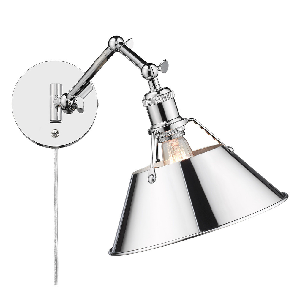 Bring industrial elegance into your home with the Yep by Golden Lighting Orwell 1-light Swing Arm Wall Lamp. Featuring a metal shade and a chrome frame, it creates a welcoming atmosphere. This polished chrome shade offers a bright, cool-toned silver color that provides a stunning, high-shine effect, integrating beautifully into any decor. The classic chrome finish elevates the design with a sleek and sophisticated appearance. Ideal for bedrooms and home offices, this lamp is damp location rated for covered spaces, and its adjustable swing arm allows for perfect positioning. Dimensions: 10"W x 9"H x 11.5"D, requires 1 E26 Medium base bulb (not included) with a maximum wattage of 100. Enjoy timeless style and exceptional function that brightens your space.