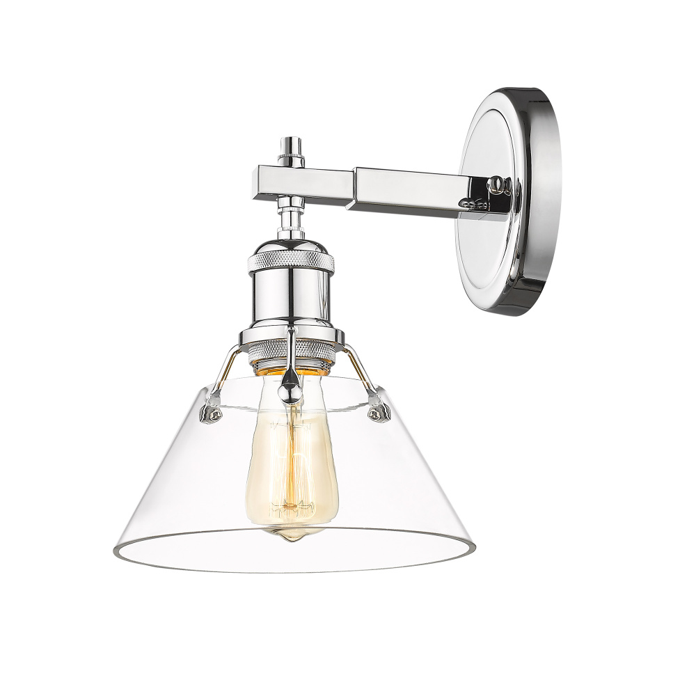 Bring industrial elegance into your home with the Yep by Golden Lighting Orwell 1-light Vanity in Chrome and Clear Glass. Featuring a clear glass shade and a chrome frame, it creates a welcoming atmosphere. The clear glass shade allows for brilliant, unobstructed light, beautifully showcasing the design of the fixture. This timeless chrome finish integrates seamlessly into a variety of decor styles, enhancing the aesthetic of any space. The fixture measures 7.5"W x 9.88"H x 8.5"D and requires one E26 medium base bulb (not included) with a maximum output of 100 watts. This damp rated vanity light is ideal for softened illumination in bathrooms and covered porches, combining practical and decorative elements for any setting. Embrace quality craftsmanship and a touch of sophistication with this beautiful vanity light.