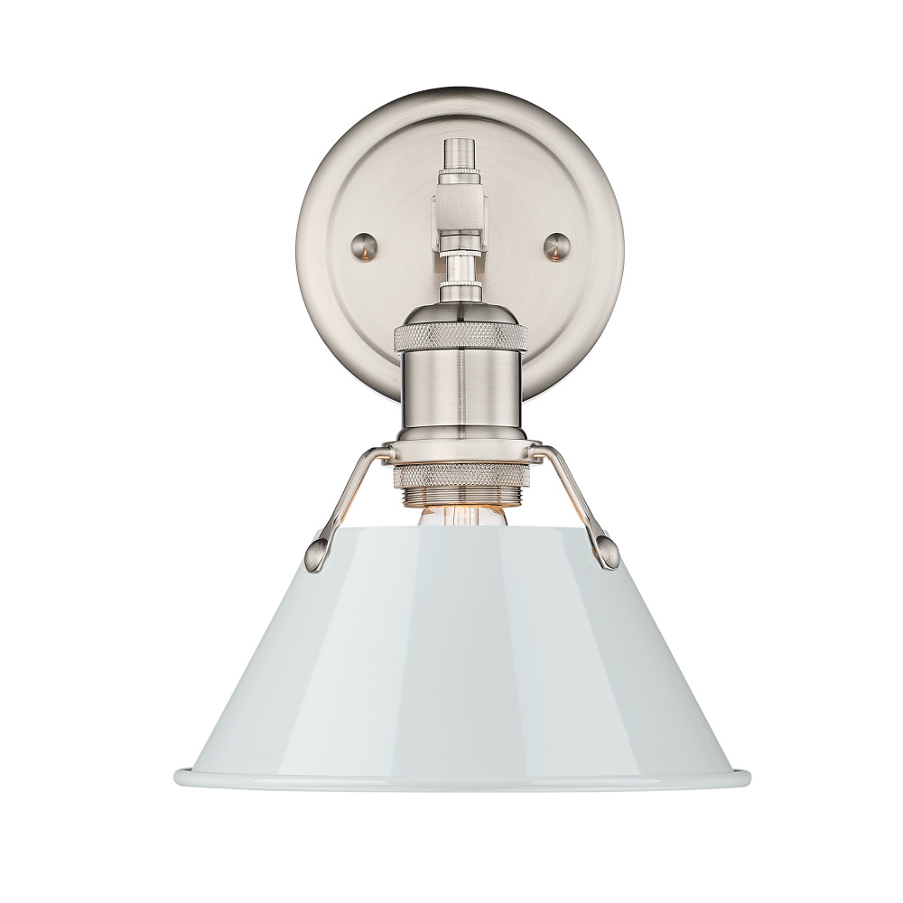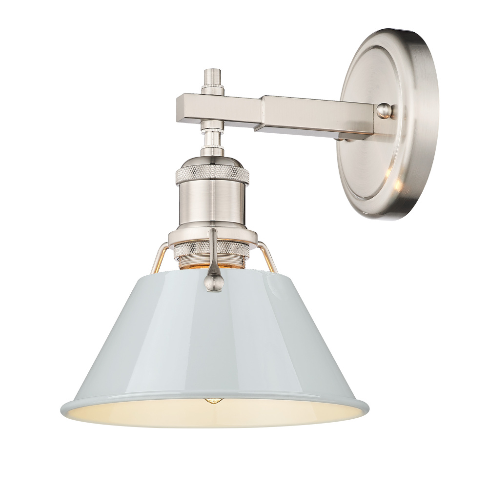 Bring serene industrial elegance into your home with the Yep by Golden Lighting Orwell 1-light Vanity. Featuring a dusky blue metal shade and a pewter frame, it creates a welcoming atmosphere. The dusky blue shade emits soft light, offering a unique and calming accent that enhances the look of your space. This finish integrates beautifully into various decor styles while providing both charm and functionality. Crafted with a timeless pewter finish, the durable electroplated surface features a directional brushing that lends a satin lustre, perfect for maintaining an understated yet sophisticated look in any setting. Ideal for brightening bathrooms, this fixture is rated for damp locations and is suitable for areas with occasional moisture. Requires 1 E26 Medium base bulb (not included) with a maximum wattage of 100. Overall dimensions are 7.5"W x 9.88"H x 8.5"D, making it a versatile option for various spaces. Enhance your bathroom with the perfect balance of style and quality.