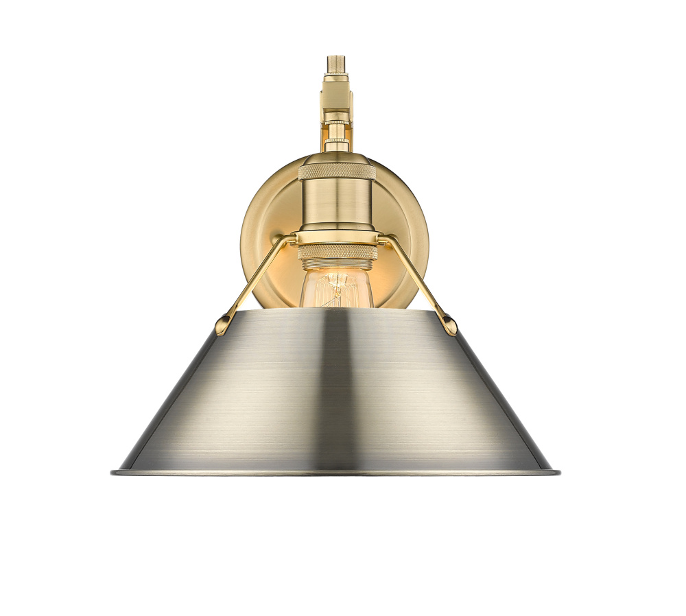 Transform your space with industrial elegance showcased in the Yep by Golden Lighting Orwell 1-light Wall Sconce. Featuring a metal shade and a sophisticated Brushed Champagne Brass frame, it creates a welcoming atmosphere. The Aged Brass metal shade features a low-luster satin sheen with a textured surface that beautifully diffuses light, adding depth to your decor. The finish provides a touch of quiet luxury and character, perfect for modern and transitional spaces. Suitable for damp locations, this fixture enhances hallways, stairways, and bathrooms while also adding cozy ambiance in bedrooms and dining areas. Installation is straightforward, and it requires 1 E26 Medium base bulb (not included), max 100 wattage, ensuring optimal illumination. With overall dimensions of 10"W x 9.63"H x 11"D, this sconce is both functional and aesthetic.