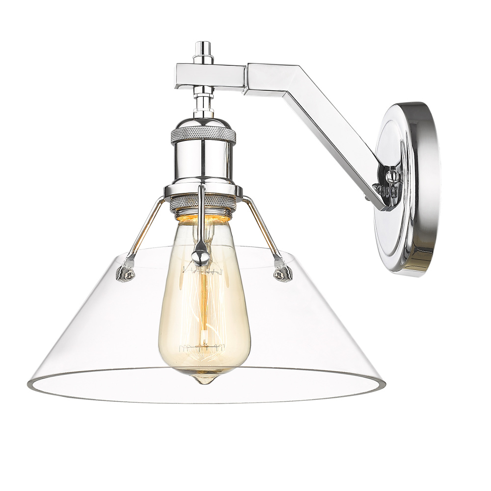 Bring industrial elegance into your home with the Yep by Golden Lighting Orwell 1-light Wall Sconce. Featuring a glass shade and a Chrome frame, it creates a welcoming atmosphere. The Clear Glass shade offers brilliant, unobstructed light, with a high-gloss shine that complements the fixture's design. Ideal for various decor styles, this fixture's highly reflective Chrome finish enhances its appeal. This wall sconce is Damp Location Rated, making it suitable for covered and semi-enclosed spaces with occasional moisture, like bathrooms and laundry rooms. Requires 1 E26 Medium base bulb (not included), with a maximum wattage of 100. Overall dimensions are 10"W x 9.63"H x 11"D. Light up your spaces with style and quality.