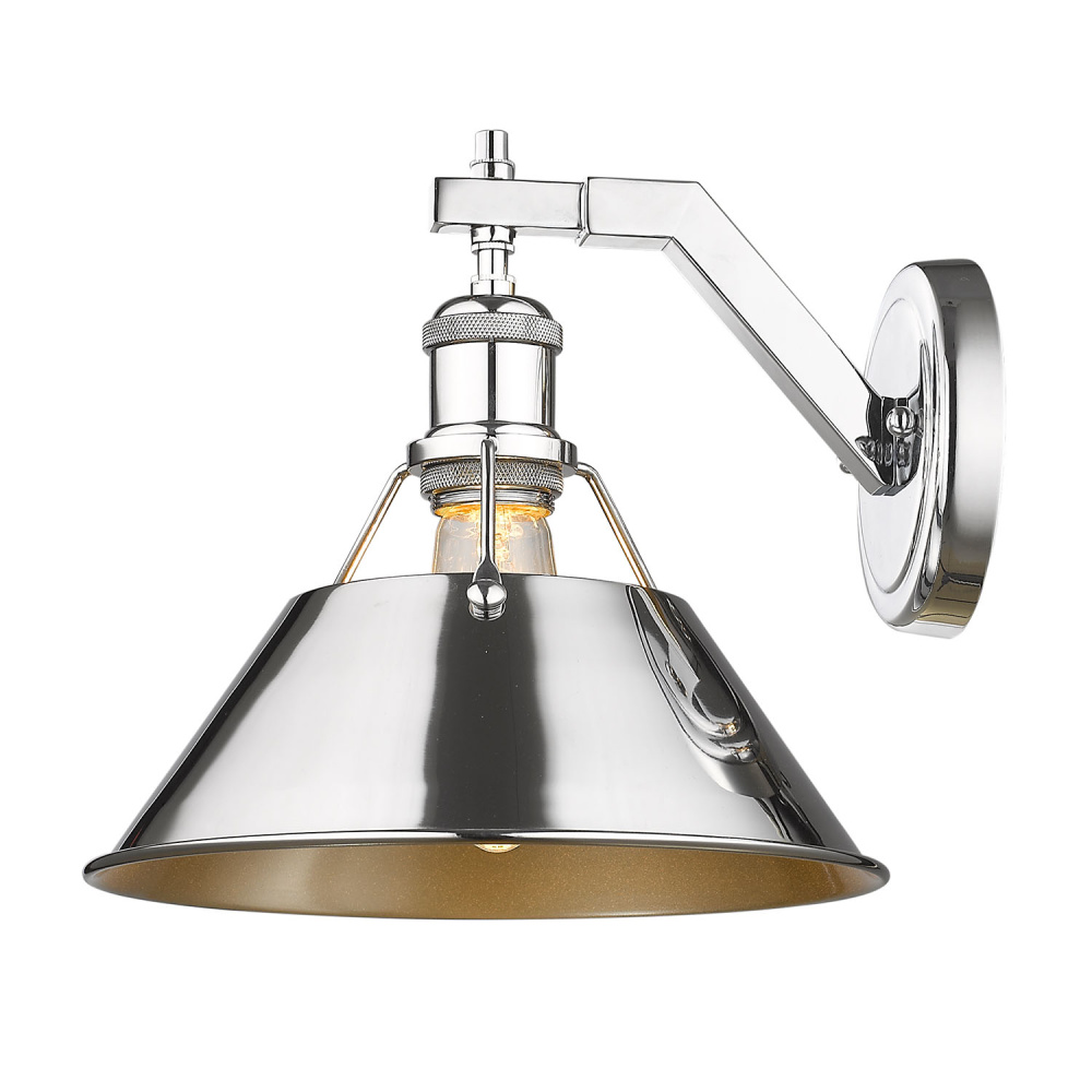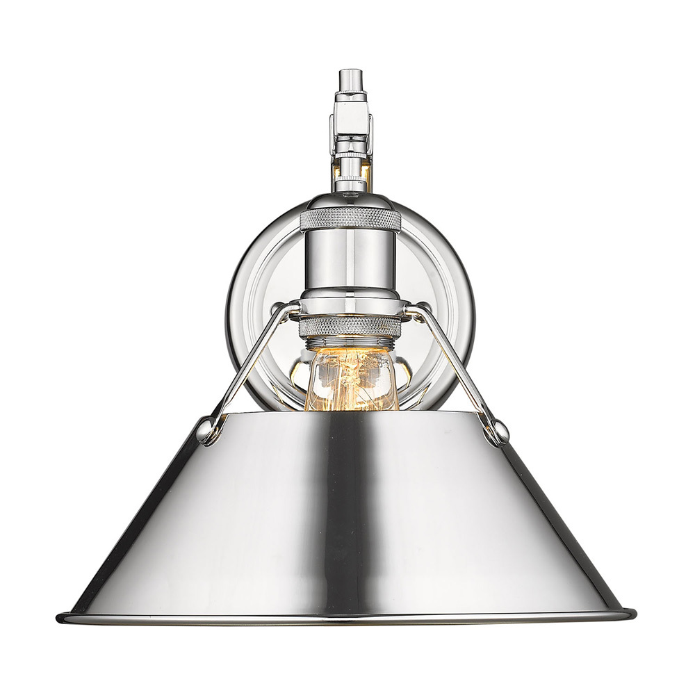 Bring industrial elegance into your home with the Yep by Golden Lighting Orwell 1-light Wall Sconce. Featuring a metal shade and a Chrome frame, it creates a welcoming atmosphere. The metal shade boasts a classic Polished Chrome electroplated finish which provides a stunning, high-shine gleam that is both sleek and sophisticated. Ideal for various decor styles, this fixture's highly reflective surface adds brightness to any space. This wall sconce is Damp Location Rated, making it suitable for covered and semi-enclosed spaces with occasional moisture, like bathrooms and laundry rooms. Requires 1 E26 Medium base bulb (not included), with a maximum wattage of 100. Overall dimensions are 10"W x 9.63"H x 11"D. Elevate your home decor with quality and style.