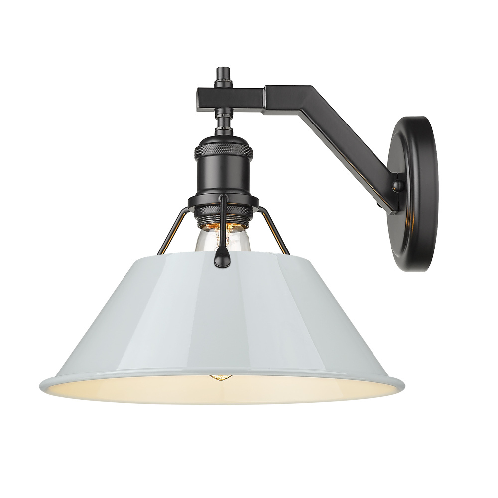 Bring industrial elegance into your home with the Yep by Golden Lighting Orwell 1-light Wall Sconce. Featuring a metal shade and a matte black frame, it creates a welcoming atmosphere. The sleek metal shade features a dusky blue finish, offering a serene and sophisticated touch to your space. The high-gloss, enamel-like sheen enhances the smooth lines, providing a unique lighting effect that complements any decor. The matte black finish is timeless and endlessly versatile, adding understated elegance that suits both minimalist and bold designs. The overall dimensions of the sconce are 10"W x 9.63"H x 11"D, and it requires 1 E26 Medium base bulb (not included) with a maximum wattage of 100. Damp location rated, this fixture is perfect for bathrooms, entryways, and areas with occasional moisture. Easy to install, it'll enhance your space with its vibrant character and quality craftsmanship.
