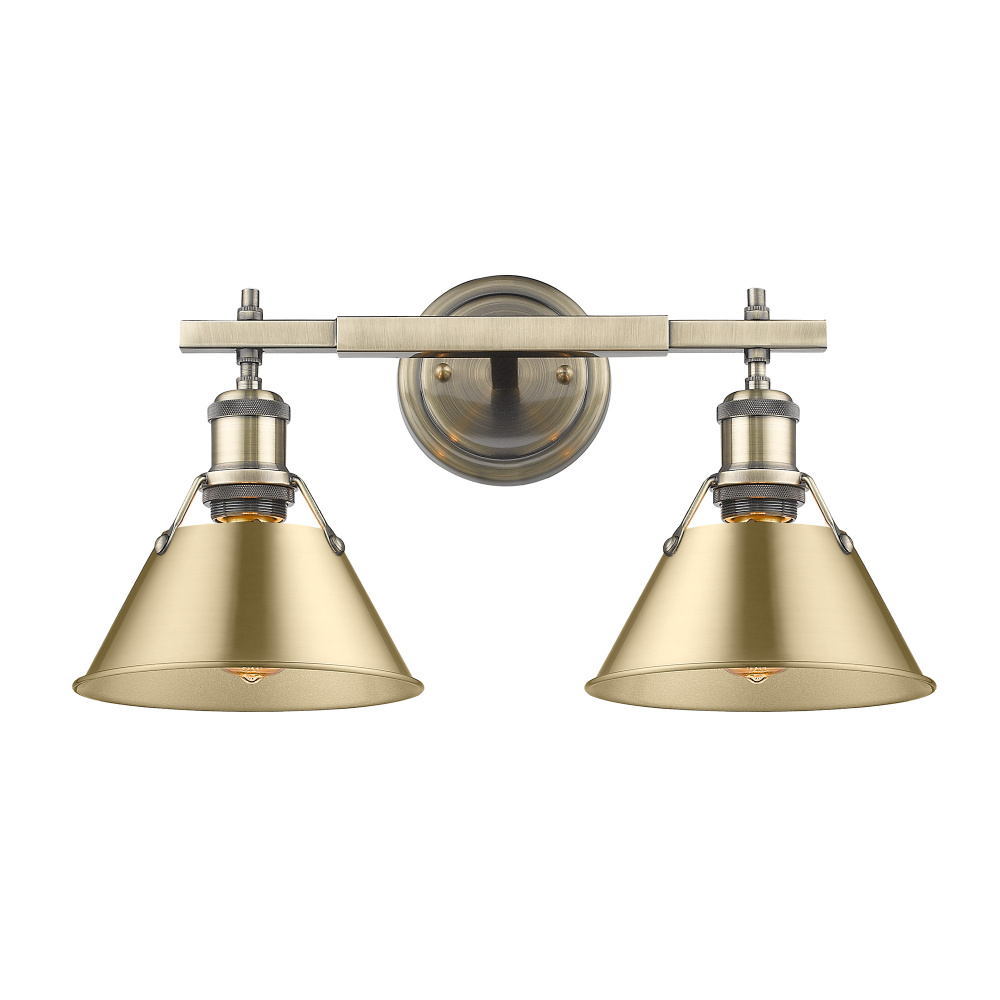 Bring industrial elegance into your home with the Yep by Golden Lighting Orwell 2-light Vanity. Featuring a metal shade and an Aged Brass frame, it creates a welcoming atmosphere. The metal shade features a Brushed Champagne Brass finish, with a pale, muted gold color that provides a soft satin sheen, perfectly blending warmth with a contemporary feel. Embrace timeless elegance with our Aged Brass finish. This sophisticated finish offers a warm, inviting glow, reminiscent of vintage heirlooms and classic hardware. Ideal for brightening up bathrooms, this fixture is Damp Location Rated and suitable for areas with occasional moisture. Requires no special installation, making it easy to set up in any covered or semi-enclosed space. Overall Dimensions: 18.25"W x 9.88"H x 8.5"D. Requires 2 E26 Medium base bulbs (not included), max 100 wattage per bulb. Enhance your bathroom ambiance with this stylish fixture that seamlessly marries aesthetics and functionality.