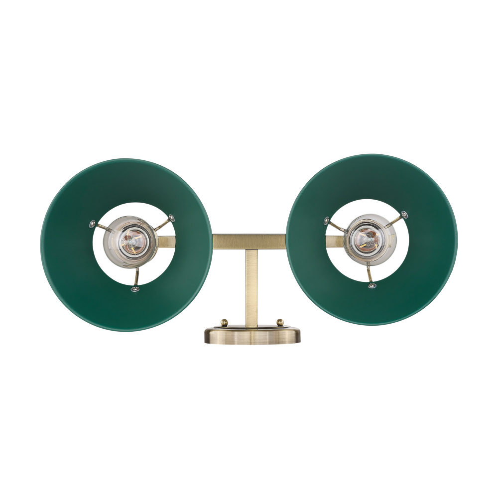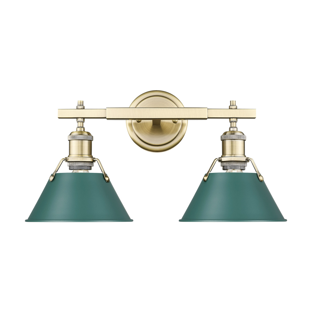 Bring industrial elegance into your home with the Yep by Golden Lighting Orwell 2-light Vanity. Featuring a metal shade and an aged brass frame, it creates a welcoming atmosphere. The metal shade showcases a Pine Green finish, inspired by the calming tones of a forest canopy, offering a sophisticated and botanical hue that perfectly absorbs light while adding a refined pop of color. Embrace timeless luxury with the Aged Brass finish, which emits a warm glow reminiscent of vintage elegance. This finish, created through a durable electroplating process, features finely-spun circular brushing that dynamically catches and diffuses light, enriching traditional and industrial-inspired spaces. Ideal for bathrooms, this fixture is damp location rated, making it perfect for covered spaces with occasional moisture. Requires installation with two E26 medium base bulbs (not included) with a maximum wattage of 100. Overall dimensions measure 18.25"W x 9.88"H x 8.5"D, ensuring ample illumination that flatters and enhances the practicality of your tasks. This vanity light stands out as a versatile and stylish choice that adds character and quality to your space.