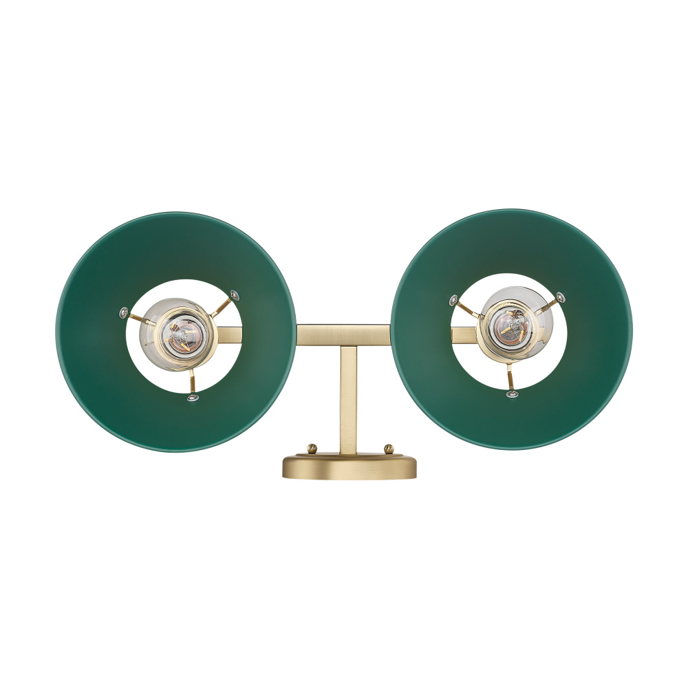 Bring industrial elegance into your home with the Yep by Golden Lighting Orwell 2-light Vanity. Featuring a Metal shade and a Brushed Champagne Brass frame, it creates a welcoming atmosphere. The Metal shade in a Pine Green finish offers a rich, deep hue with a smooth, matte surface that absorbs light beautifully while adding a refined pop of color. This finish combines the warmth of brass with the softness of silver, ensuring a chic and versatile aesthetic. Ideal for bathrooms, this fixture is Damp Location Rated, suitable for spaces with occasional moisture like covered porches or laundry rooms. Requires 2 E26 Medium base bulbs (not included), with a maximum wattage of 100 watts each. Overall Dimensions: 18.25"W x 9.88"H x 8.5"D. The open-top shade design allows for additional ambient lighting, making this an elegant choice for your home. Embrace style and quality with this beautifully crafted fixture.