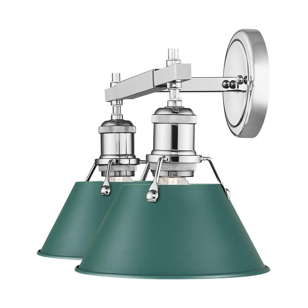Bring industrial elegance into your home with the Yep by Golden Lighting Orwell 2-light Vanity. Featuring a metal shade and a chrome frame, it creates a welcoming atmosphere. The metal shade, finished in a rich Pine Green, beautifully absorbs light, offering understated elegance. The smooth, non-reflective surface provides a calming glow perfect for bathroom settings. The brilliant Polished Chrome finish offers a crisp, clean look that seamlessly integrates into a variety of decor styles from modern to classic. It’s created through a durable electroplating process that not only adds brightness but also ensures easy cleaning. This fixture is damp location rated, making it ideal for bathrooms, covered porches, or laundry rooms. Requires no additional installation adjustments and fits into standard fixtures with ease. The unit requires 2 E26 Medium base bulbs (not included), with a maximum wattage of 100 per bulb. With overall dimensions of 18.25"W x 9.88"H x 8.5"D, it is optimized for both illumination and aesthetic appeal, providing practical task lighting with style. Transform your space with this quality fixture that merges functionality and vintage charm.