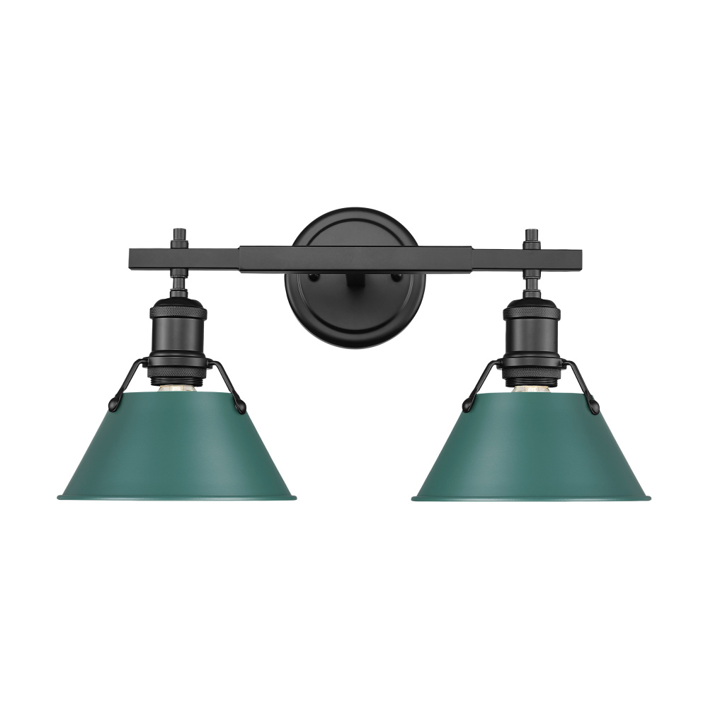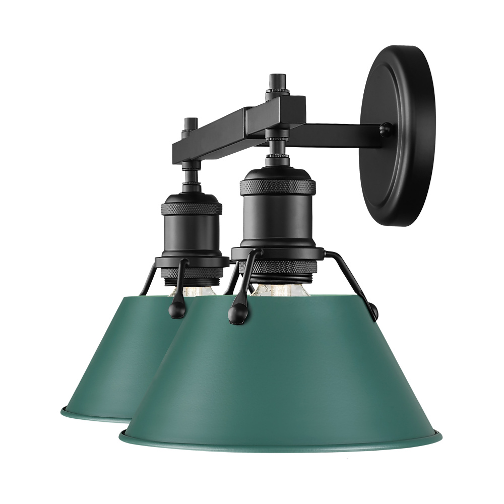 Bring industrial elegance into your home with the Yep by Golden Lighting Orwell 2-light Vanity. Featuring a metal shade and a matte black frame, it creates a welcoming atmosphere. The metal shade in Pine Green provides a rich, saturated color with a smooth finish, beautifully diffusing light and creating an inviting glow. Its deep, calming tone is inspired by nature, making it a stylish addition to your decor. The matte black finish is timeless and versatile, offering an understated elegance that complements various decor styles. Suitable for covered and semi-enclosed spaces, this fixture is perfect for bathrooms, laundry rooms, and covered porches. Overall dimensions are 18.25"W x 9.88"H x 8.5"D, and it requires 2 E26 Medium base bulbs (not included) with a maximum wattage of 100 per bulb. Elevate your bathroom with this stunning, practical solution that merges quality with aesthetic appeal.