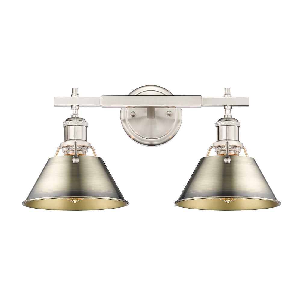 Bring industrial elegance into your home with the Yep by Golden Lighting Orwell 2-light Vanity. Featuring a metal shade and a chic pewter frame, it creates a welcoming atmosphere in your space. The metal shade complements the Aged Brass finish beautifully, with its warm, antiqued glow that enhances the elegant styling of this fixture. The Pewter finish boasts a soft, timeless appeal with a beautiful satin lustre that diffuses light elegantly. This vanity light is perfect for brightening up bathrooms while offering practical task illumination. It is Damp Location Rated for convenience and safety. Installation is simple, requiring 2 E26 Medium base bulbs (not included) with a maximum wattage of 100 per bulb. With overall dimensions of 18.25"W x 9.88"H x 8.5"D, the Orwell seamlessly captures the vintage charm and quality your space deserves.