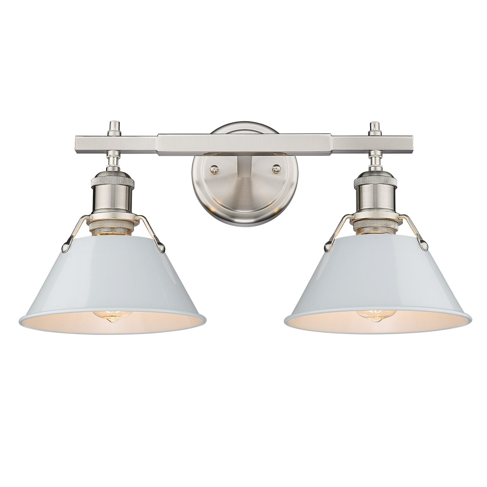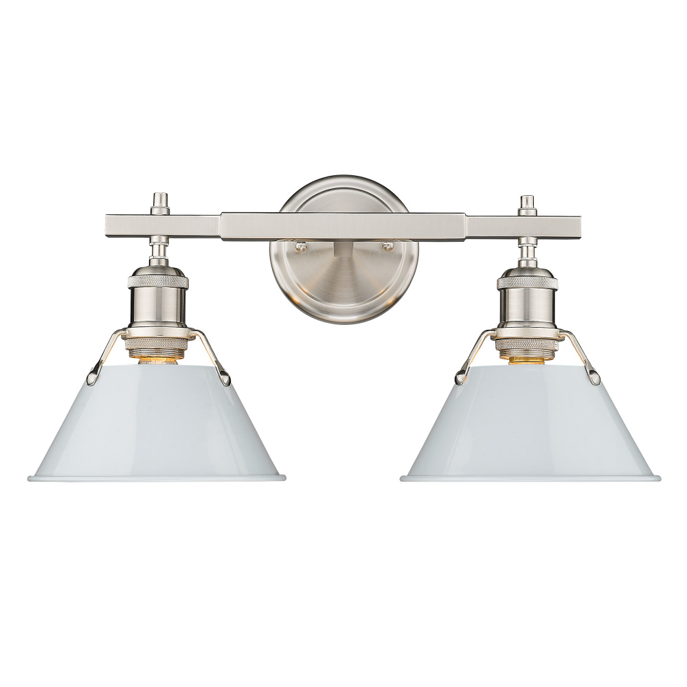 Bring industrial elegance into your home with the Yep by Golden Lighting Orwell 2-light Vanity. Featuring a metal shade and a pewter frame, it creates a welcoming atmosphere. The dusky blue shade finishes off the look with its smooth, glossy surface that softly diffuses light, providing a serene accent perfect for contemporary or traditional spaces. Our pewter finish offers a timeless appeal, adding warmth that complements both classic and modern interiors. Suitable for damp locations, this fixture is ideal for bathrooms, covered porches, and laundry rooms. It requires 2 E26 medium base bulbs (not included) with a maximum wattage of 100 per bulb. With overall dimensions of 18.25"W x 9.88"H x 8.5"D, it's the perfect choice for task illumination and ambience, making a lasting impression with quality craftsmanship.