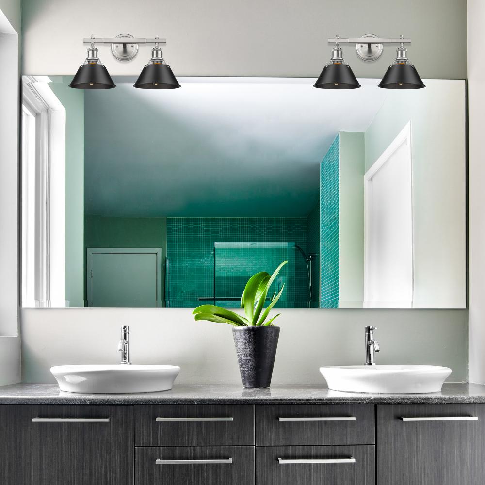 Reveal modern industrial elegance in your home with the Yep by Golden Lighting Orwell 2-light Vanity. Featuring a matching metal shade and a pewter frame, it radiates sophistication and charm. The metal shade in Matte Black provides a timeless, clean look with a non-reflective finish that absorbs light while retaining a smooth texture. Our pewter finish offers a classic touch with its subtle warmth and electroplated durability, creating an inviting glow in any setting. Perfect for enhancing bathrooms, the fixture is also Damp Location Rated, suitable for areas with occasional moisture. Its installation requirements are simple, making it a practical choice for various spaces. Overall Dimensions are 18.25"W x 9.88"H x 8.5"D, compatible with 2 E26 Medium base bulbs (not included), providing a maximum wattage of 100 per bulb. Elevate your bathroom space with this stylish fixture that merges quality with modern design.