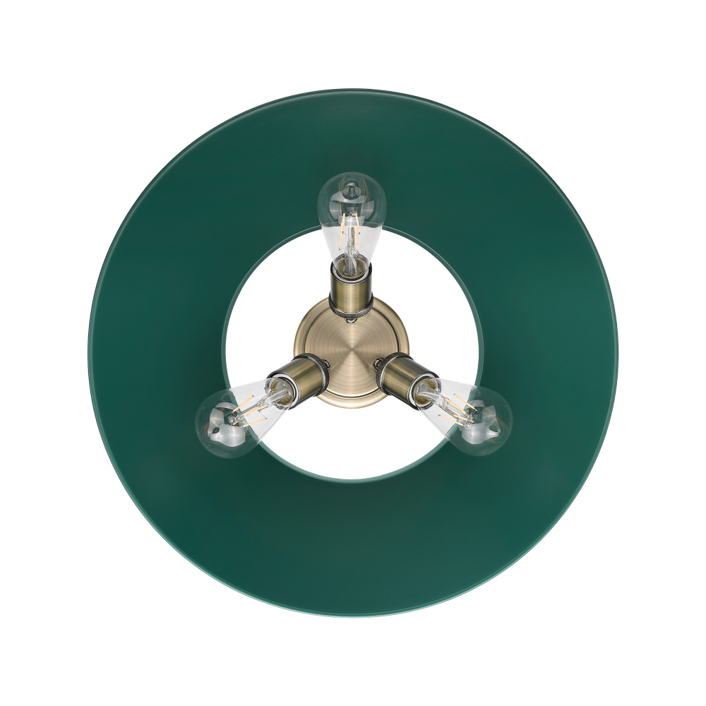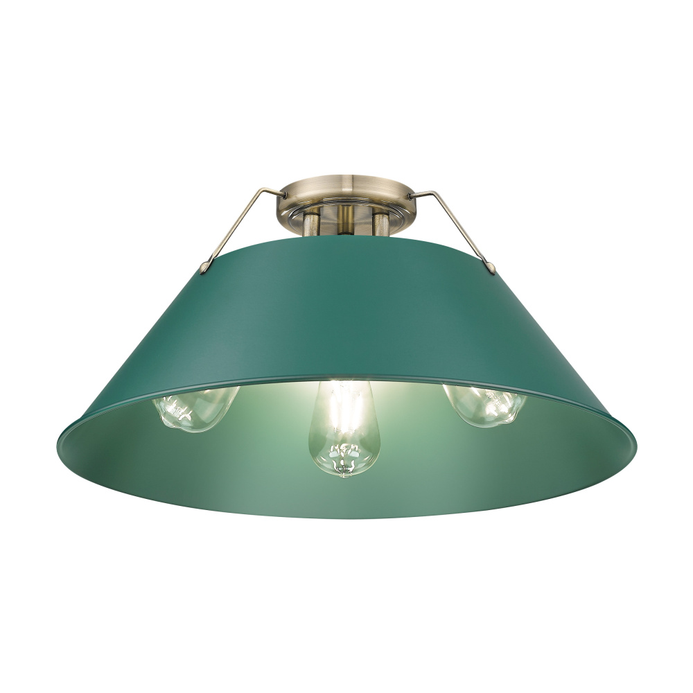 Elevate your home with vintage industrial elegance through the Yep by Golden Lighting Orwell 3-light Flush Mount. Featuring a metal shade and an aged brass frame, it creates a welcoming atmosphere. The metal shade, finished in Pine Green, presents a rich and calming hue. This timeless color beautifully absorbs light, enhancing the character of your space. Embrace the sophistication of the aged brass finish, which offers a warm, inviting glow reminiscent of vintage décor, designed to add luxury and depth to traditional and industrial spaces. Ideal for low ceilings, this fixture is perfect for hallways, closets, and laundry areas. It is damp location rated, ensuring suitability for covered spaces with occasional moisture. Overall dimensions are 18.75"W x 9.25"H x 18.75"D, and it requires 3 E26 Medium base bulbs (not included) with a maximum wattage of 60 per bulb. Illuminate your lifestyle with this stylish piece that merges functionality and vintage charm, promising to transform any room with its refined design.