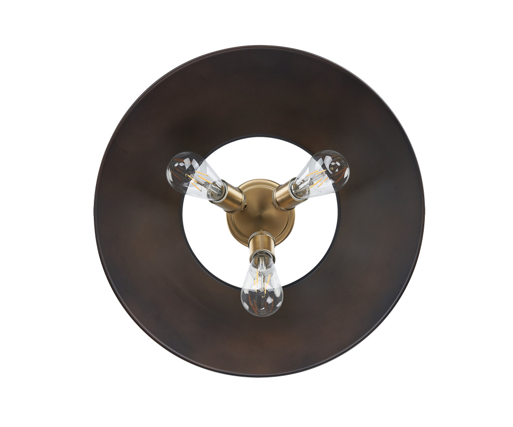 Bring industrial elegance into your home with the Yep by Golden Lighting Orwell 3-light Flush Mount. Featuring a metal shade and a brushed champagne brass frame, it creates a welcoming atmosphere. The metal shade showcases a rubbed bronze finish distinguished by subtle coppery highlights, providing a rich, warm glow that beautifully diffuses light. The brushed champagne brass finish adds modern sophistication with its understated and elegant appeal. Ideal for low ceilings in hallways, closets, laundry areas, and bathrooms, the fixture is damp location rated, making it suitable for covered and semi-enclosed spaces with occasional moisture. Installation is a breeze, and the fixture requires three E26 Medium base bulbs (not included) with a maximum wattage of 60 each. Overall dimensions are 18.75"W x 9.25"H x 18.75"D, offering compact design that meets wide illumination needs. Experience the perfect blend of timeless style and modern functionality with this quality flush mount, designed to highlight your decor with ease.