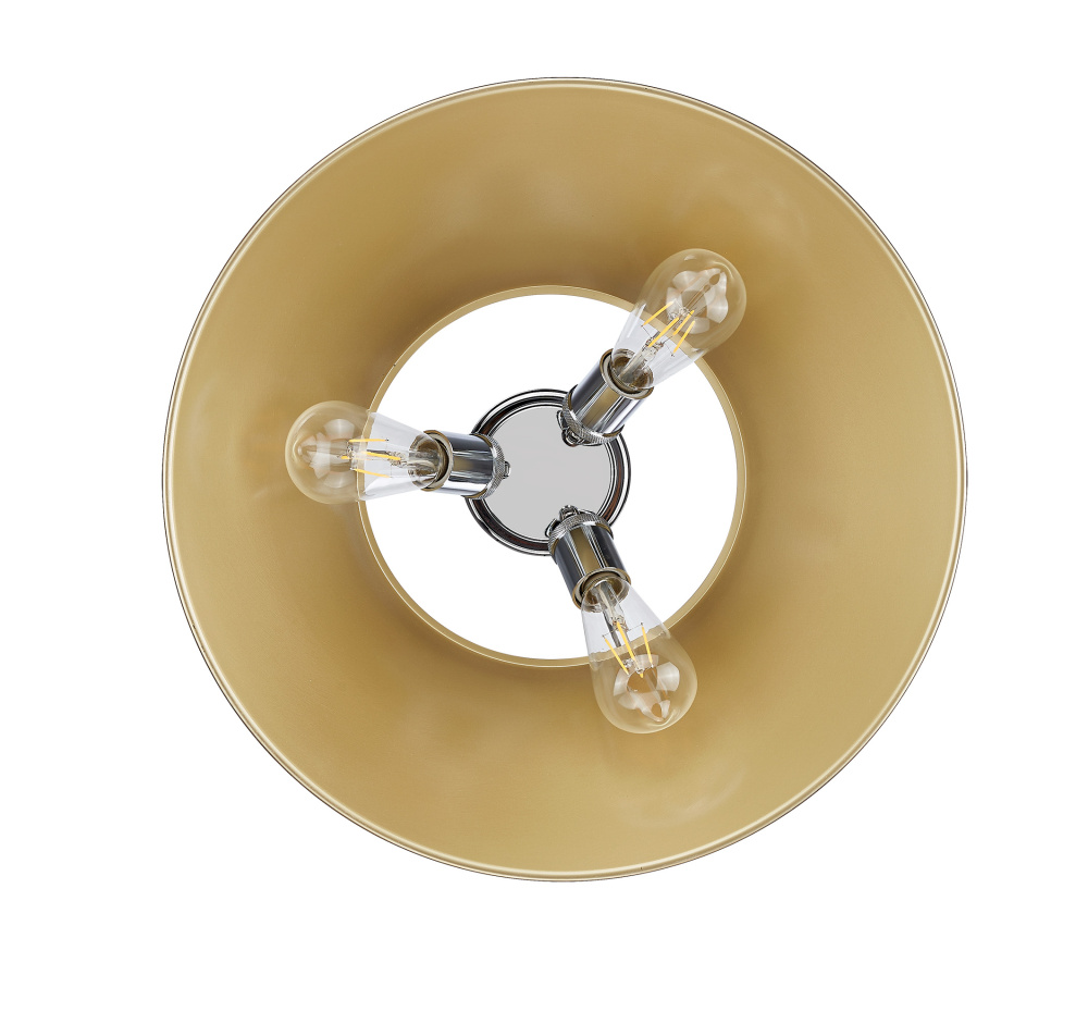 Bring industrial elegance into your home with the Yep by Golden Lighting Orwell 3-light Flush Mount. Featuring a metal shade and polished chrome frame, it creates a welcoming atmosphere. The durable metal shade features a brushed champagne brass finish that adds a modern touch, beautifully catching the light with its satin sheen. Brilliant and timeless, our Polished Chrome finish offers a crisp, clean look that integrates seamlessly into any decor, from ultra-modern to classic traditional. Ideal for low ceilings in hallways, closets, laundry areas, and bathrooms, this fixture is suitable for damp locations and is easy to maintain. Dimensions: Overall Dimensions: 18.75"W x 9.25"H x 18.75"D. Requires 3 E26 Medium base bulbs (not included) with a maximum wattage of 60. Elevate your spaces with this striking fixture that exudes quality and style.