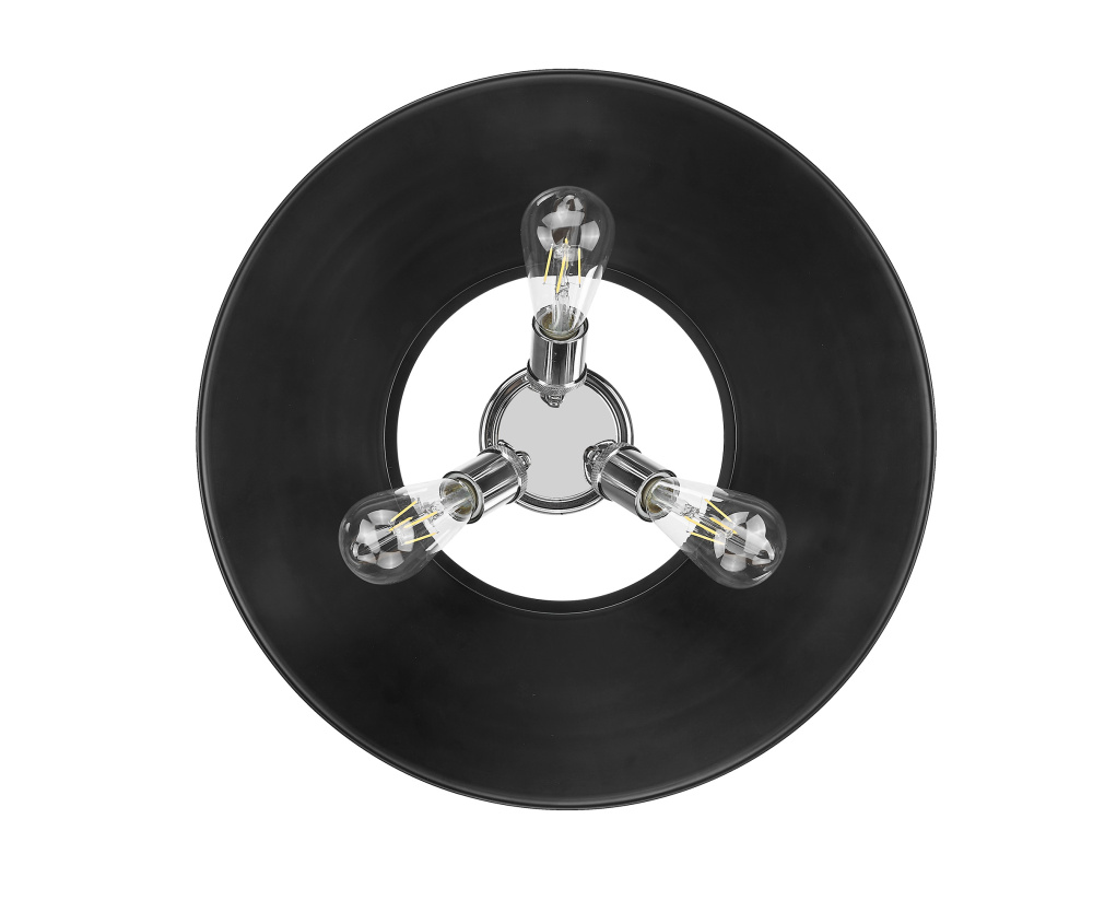 Bring industrial elegance into your home with the Yep by Golden Lighting Orwell 3-light Flush Mount. Featuring a metal shade and polished chrome frame, it creates a welcoming atmosphere. The durable metal shade showcases a classic matte black finish, adding a sophisticated touch while absorbing light for a cozy ambiance. Brilliant and timeless, our Polished Chrome finish offers a crisp, clean look that integrates seamlessly into any decor, from ultra-modern to classic traditional. Ideal for low ceilings in hallways, closets, laundry areas, and bathrooms, this fixture is suitable for damp locations and is easy to maintain. Dimensions: Overall Dimensions: 18.75"W x 9.25"H x 18.75"D. Requires 3 E26 Medium base bulbs (not included) with a maximum wattage of 60. Elevate your spaces with this striking fixture that exudes quality and style.