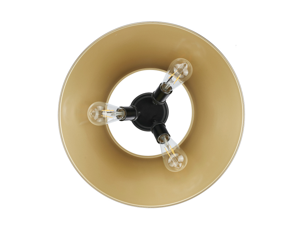 Bring industrial elegance into your home with the Yep by Golden Lighting Orwell 3-light Flush Mount. Featuring a Metal shade and a Matte Black frame, it creates a welcoming atmosphere. This Metal shade showcases a Brushed Champagne Brass finish, which features a soft satin luster and a fine brushed texture that adds a modern, sophisticated edge. The Matte Black finish exemplifies clean, modern style, providing a non-reflective surface that absorbs light for a sophisticated look. Its smooth, timeless character complements virtually any decor, blending seamlessly from minimalist to bold designs. Ideal for low ceilings in hallways, closets, laundry areas, bathrooms, and more, this flush mount is damp location rated, suited for covered spaces with occasional moisture. Requires 3 E26 Medium base bulbs (not included), max wattage per bulb is 60. Overall dimensions are 18.75"W x 9.25"H x 18.75"D. Create a chic and functional atmosphere in your home with this versatile fixture, designed for both style and quality.