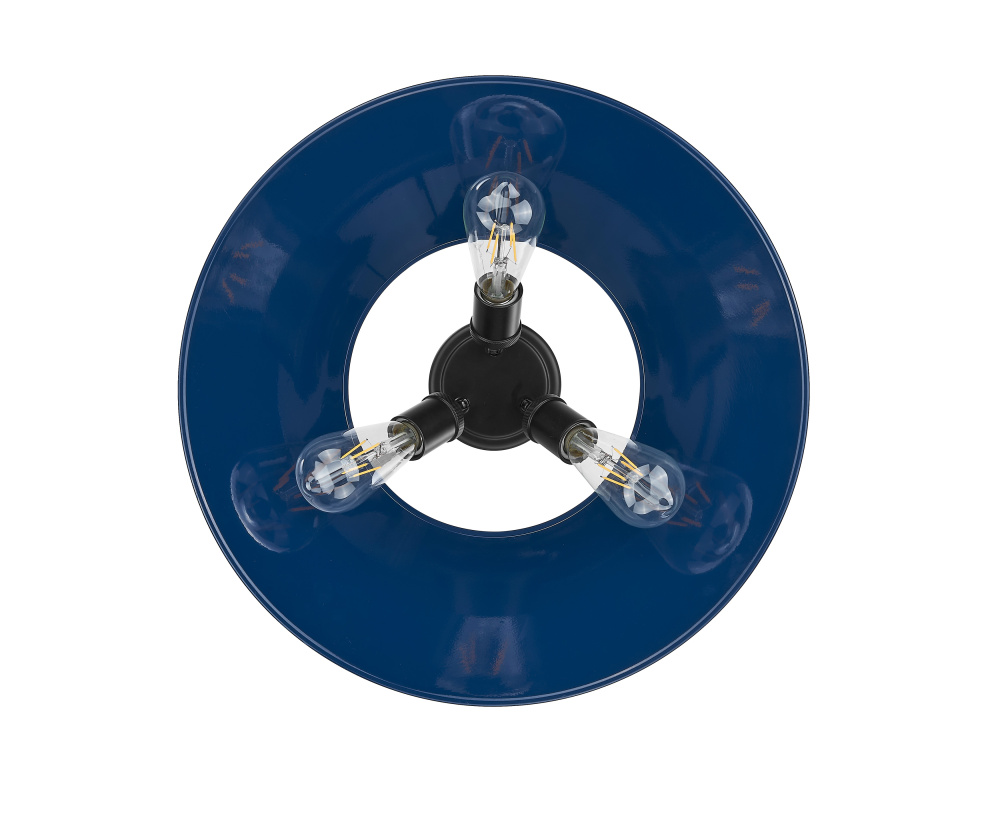 Bring industrial elegance into your home with the Yep by Golden Lighting Orwell 3-light Flush Mount. Featuring a metal shade and a matte black frame, it creates a welcoming atmosphere. The Navy Blue metal shade showcases a rich, deep navy with a glossy finish that beautifully reflects light, adding a sophisticated touch to any room. Our Matte Black finish is timeless and versatile, providing an understated elegance that complements various decor styles, from modern to industrial. Ideal for low ceilings in hallways, closets, laundry areas, and bathrooms, this fixture is Damp Location Rated, making it suitable for spaces with occasional moisture. It requires 3 E26 Medium base bulbs (not included), max 60 watts per bulb. Overall dimensions are 18.75"W x 9.25"H x 18.75"D, ensuring wide illumination in compact spaces. Elevate your home’s aesthetic with this quality fixture that blends functionality and style.