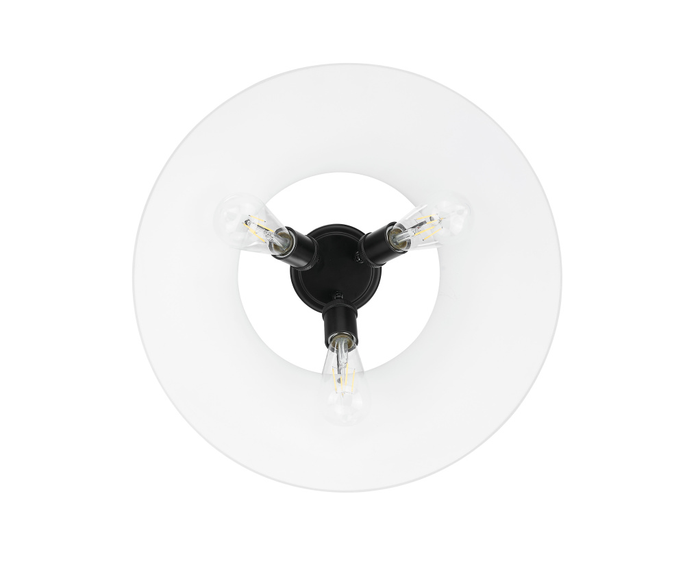Bring industrial elegance into your home with the Yep by Golden Lighting Orwell 3-light Flush Mount. Featuring an opal glass shade and a matte black frame, it creates a welcoming atmosphere. The Opal Glass shade is milky and translucent, diffusing light evenly to create a soft, glare-free glow. Our Matte Black finish is timeless and versatile, providing an understated elegance that complements various decor styles, from modern to industrial. Ideal for low ceilings in hallways, closets, laundry areas, and bathrooms, this fixture is Damp Location Rated, making it suitable for spaces with occasional moisture. It requires 3 E26 Medium base bulbs (not included), max 60 watts per bulb. Overall dimensions are 18.75"W x 9.25"H x 18.75"D, ensuring wide illumination in compact spaces. Elevate your home’s aesthetic with this quality fixture that blends functionality and style.