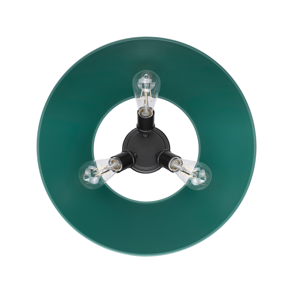 Bring industrial elegance into your home with the Yep by Golden Lighting Orwell 3-light Flush Mount. Featuring a metal shade and a matte black frame, it creates a welcoming atmosphere. The Pine Green metal shade boasts a deep, rich green color with a smooth, non-reflective finish, offering a touch of heritage style while beautifully diffusing light. Our Matte Black finish is timeless and versatile, providing an understated elegance that complements various decor styles, from modern to industrial. Ideal for low ceilings in hallways, closets, laundry areas, and bathrooms, this fixture is Damp Location Rated, making it suitable for spaces with occasional moisture. It requires 3 E26 Medium base bulbs (not included), max 60 watts per bulb. Overall dimensions are 18.75"W x 9.25"H x 18.75"D, ensuring wide illumination in compact spaces. Elevate your home’s aesthetic with this quality fixture that blends functionality and style.