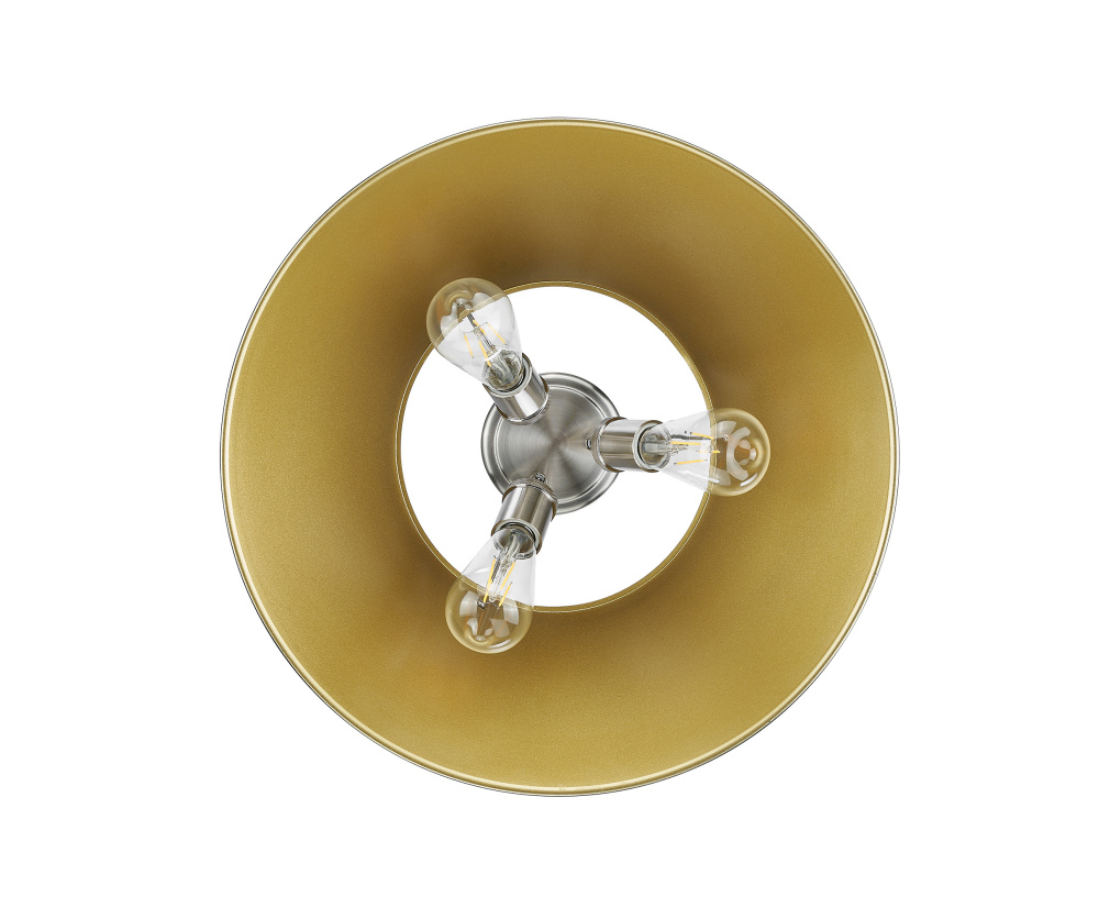Bring industrial elegance into your home with the Yep by Golden Lighting Orwell 3-light Flush Mount. Featuring a Metal shade and a Pewter frame, it creates a welcoming atmosphere. The metal shade boasts an Aged Brass finish, characterized by a warm, antiqued gold tone with darker undertones that add visual depth and charm to your decor. Our Pewter finish offers a classic alternative to brighter tones, bringing understated sophistication for both classic and contemporary interiors. Ideal for low ceilings in hallways, closets, laundry areas, and bathrooms, this fixture is damp location rated for covered and semi-enclosed spaces. Requires 3 E26 Medium base bulbs (not included), Max 60 wattage per bulb. Overall dimensions are 18.75"W x 9.25"H x 18.75"D. Elevate your space with this beautifully constructed lighting solution that balances timeless style with functionality.