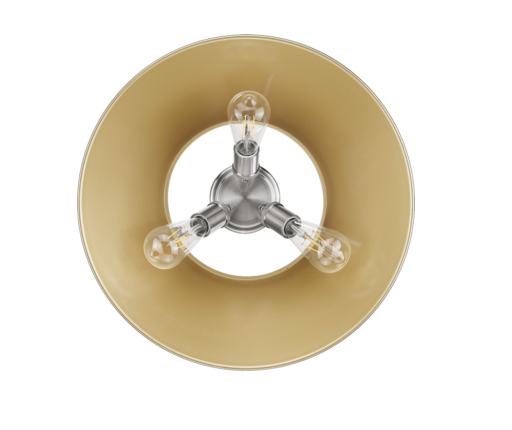 Bring industrial elegance into your home with the Yep by Golden Lighting Orwell 3-light Flush Mount. Featuring a metal shade and a pewter frame, it creates a welcoming atmosphere. The metal shade, finished in Brushed Champagne Brass, offers a refined texture that beautifully catches the light. Our Pewter finish provides a timeless appeal, adding warmth and sophistication to both classic and contemporary interiors. This fixture is ideal for low ceilings in hallways, closets, laundry areas, and bathrooms, offering damp location safety for those spaces. The overall dimensions are 18.75"W x 9.25"H x 18.75"D, and it requires 3 E26 Medium base bulbs (not included), with a maximum wattage of 60 per bulb. Elevate your space with this quality fixture that balances functionality and style.
