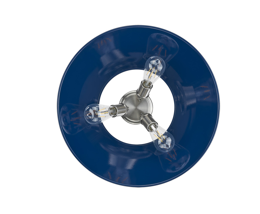 Bring industrial elegance into your home with the Yep by Golden Lighting Orwell 3-light Flush Mount. Featuring a metal shade and a Pewter frame, it creates a welcoming atmosphere. The Navy Blue metal shade boasts a rich, deep navy finish with a highly reflective, enamel-like high-gloss sheen, providing a bold and sophisticated pop of color. Our Pewter finish offers a soft and classic alternative to brighter silver tones, created through a durable electroplating process that gives the surface a satin luster for an elegant, non-glare glow. Ideal for low ceilings in hallways, laundry areas, and bathrooms, this fixture is Damp Location Rated, making it suitable for covered and semi-enclosed spaces with occasional moisture. Requires three E26 Medium base bulbs (not included) with a maximum wattage of 60 per bulb. Overall dimensions are 18.75"W x 9.25"H x 18.75"D. The perfect choice for those looking to add a touch of preppy, heritage character to any space, blending style with quality.