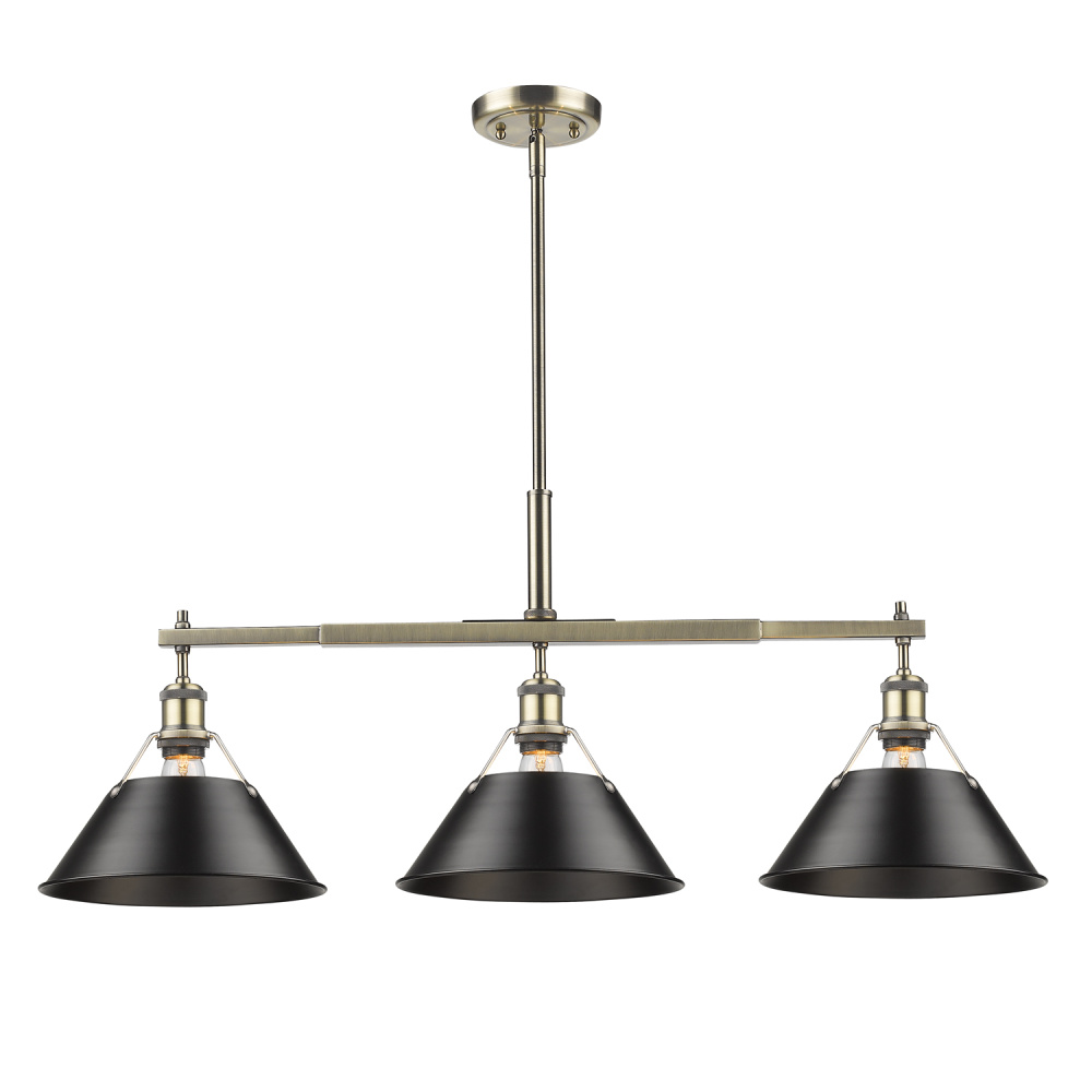 Bring industrial design into your home with the Yep by Golden Lighting Orwell 3-light Island Light. Designed with a metal shade and an Aged Brass frame, it creates an alluring atmosphere. The Matte Black metal shade, with its non-reflective surface, delivers a clean and modern look that seamlessly integrates into various decor styles. The Aged Brass finish offers a warm, inviting glow that celebrates classic heritage, making it the perfect choice for a stylish kitchen. This multi-light fixture, ideal for kitchen islands, is rated for dry locations and is easily adjustable in height from 17.125" to 59.125", with compatibility for sloped ceilings. It requires three E26 Medium base bulbs (not included) with a maximum wattage of 100 per bulb and measures overall 35.75"W x 14.5"H x 10"D. Add a touch of sophistication and functionality to your space with this versatile lighting solution.