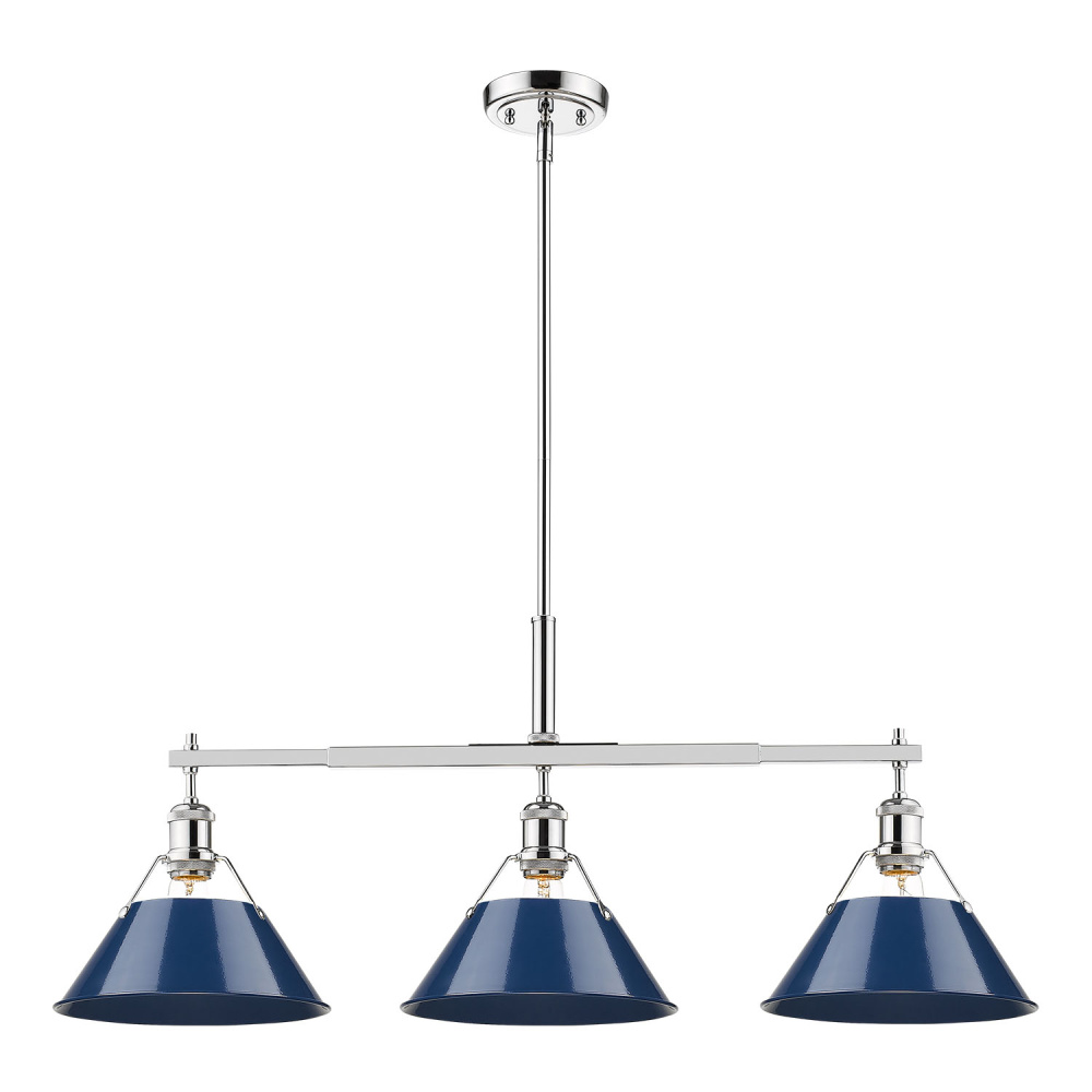 Bring industrial elegance into your home with the Yep by Golden Lighting Orwell 3-light Island Light. Featuring a metal shade and a polished chrome frame, it creates a welcoming atmosphere. The Navy Blue metal shade offers a rich, deep color with a high-gloss sheen that provides a bold presence, perfect for the modern kitchen. The finish adds a sophisticated shine while easily integrating into various interior styles. Rated for dry locations, this fixture is ideal for kitchens, dining areas, and hallways. Easy to install and adjustable in height, it requires 3 E26 medium base bulbs (max 100 watts each). Overall dimensions measure 35.75"W x 14.5"H x 10"D, making it an excellent choice for striking accent lighting.