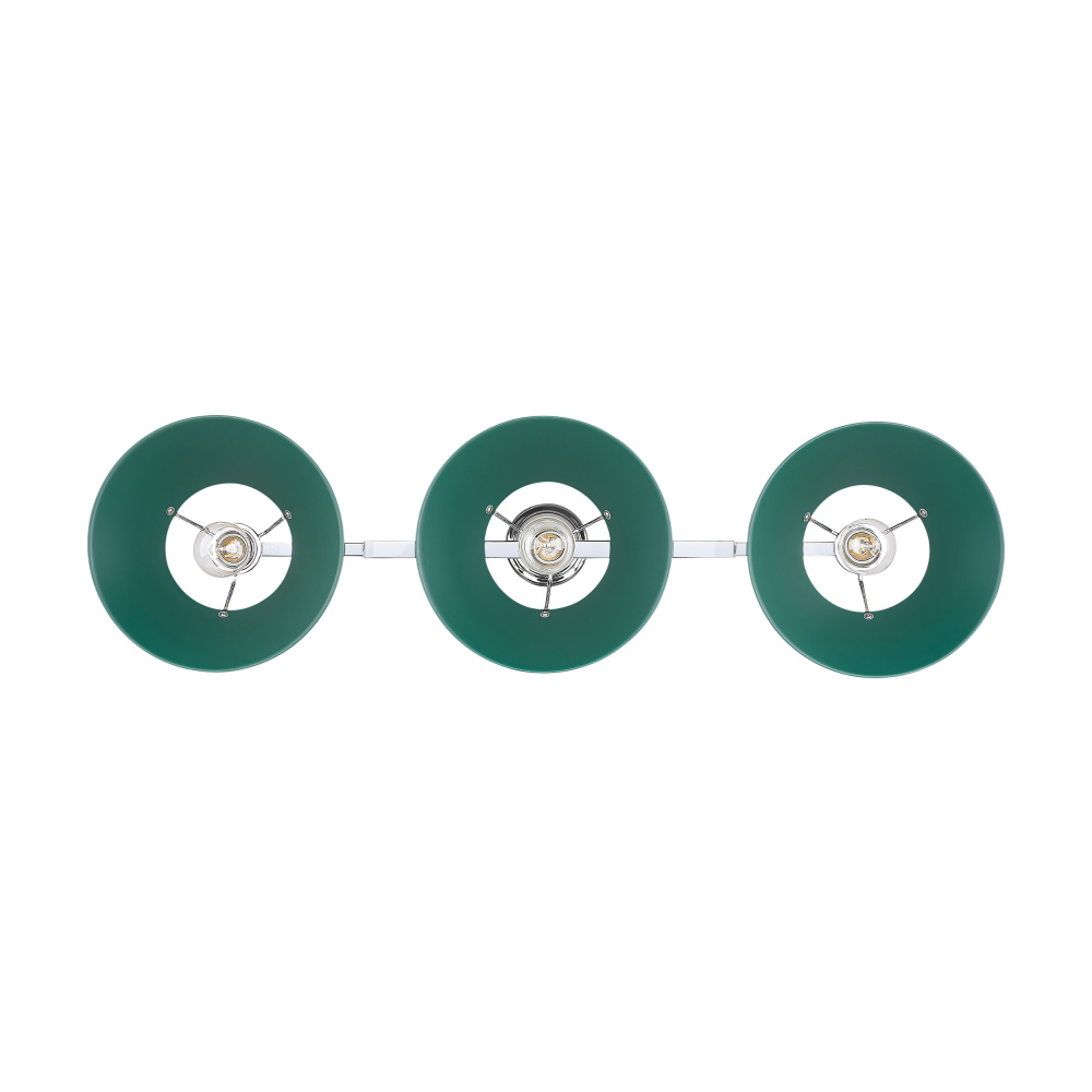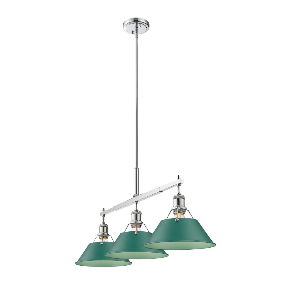 Bring industrial elegance into your home with the Yep by Golden Lighting Orwell 3-light Island Light. Featuring a metal shade and a Chrome frame, it creates a welcoming atmosphere. The Pine Green metal shade, inspired by the deep tones of a forest, boasts a rich, velvety finish that beautifully absorbs light, enhancing the charm of your space. With its brilliant and timeless Chrome finish, this fixture offers a crisp and clean look, perfect for various decor styles. Tailored for kitchen islands, this fixture is dry location rated—ideal for indoor spaces exempt from moisture. It is sloped-ceiling compatible and features an adjustable height ranging from 17.125" to 59.125", making installation a breeze in any setting. Measuring at 35.75"W x 14.5"H x 10"D, it requires 3 E26 Medium base bulbs, with a maximum of 100 watts each. Illuminate your kitchen with quality and style, encapsulating both functionality and sophistication.