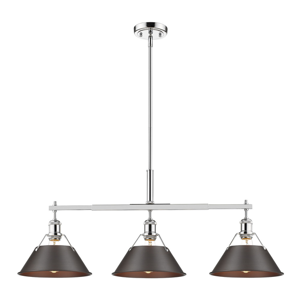 Bring industrial elegance into your home with the Yep by Golden Lighting Orwell 3-light Island Light. Featuring a metal shade and a Chrome frame, it creates a welcoming atmosphere.\n\nThe sleek metal shade boasts a Rubbed Bronze finish with a rich, dark brown color that adds a warm touch to the light, while the brushed texture reveals warm highlights for a sophisticated look.\n\nThe Polished Chrome finish offers a brilliant and timeless appearance, providing a stunning, high-shine gleam that seamlessly integrates into a wide range of decor styles.\n\nDesigned for kitchen islands, this fixture is dry location rated, ensuring its ideal use in indoor spaces not subject to moisture. The sloped-ceiling compatible design allows for easy installation, adjusting the hanging length from 17.125" to 59.125".\n\nOverall Dimensions: 35.75"W x 14.5"H x 10"D. Requires 3 E26 Medium base bulbs (not included), with a maximum wattage of 100 per bulb.\n\nPerfect for creating an impactful modern flair in your home, the Yep by Golden Lighting Orwell light fixture embodies quality and style.