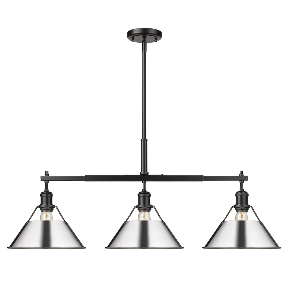 Bring industrial elegance into your home with the Yep by Golden Lighting Orwell 3-light Island Light in Matte Black and Chrome shade. Featuring a metal shade and a matte black frame, it creates a welcoming atmosphere. The chrome shade brings a polished finish that reflects light beautifully, adding a sleek and sophisticated element to your space. The matte black finish supports a timeless style that perfectly complements various design aesthetics, from contemporary to industrial. Tailored for kitchen islands, this fixture is Dry Location Rated, making it ideal for indoor use. Easily install this adjustable height fixture on angled ceilings, customizing the hanging length to match your space. The overall dimensions are 35.75"W x 14.5"H x 10"D, and it requires 3 E26 medium base bulbs (not included) with a maximum wattage of 100 per bulb. Enhance your kitchen with a unique blend of modern sophistication and functional design for an inviting dining atmosphere.