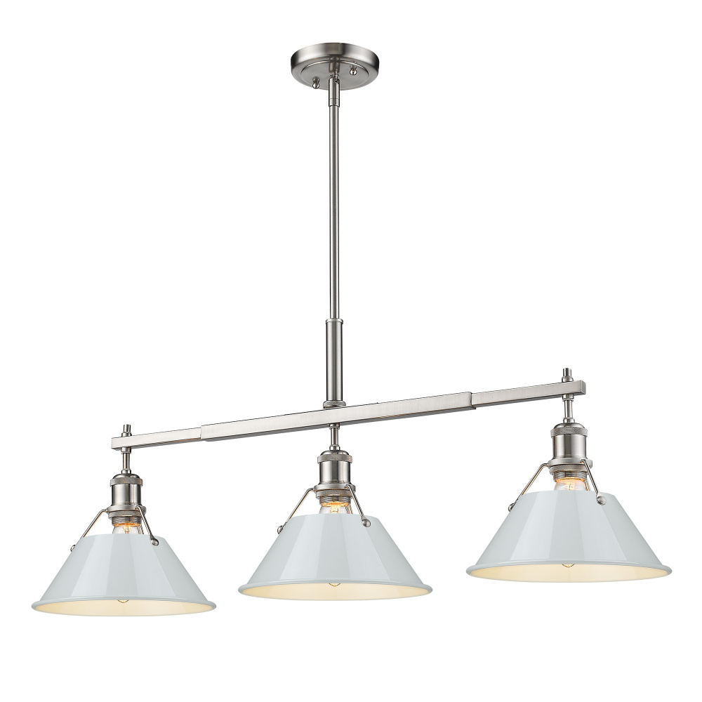 Bring industrial elegance into your home with the Yep by Golden Lighting Orwell 3-light Island Light. Featuring a metal shade and a pewter frame, it creates a welcoming atmosphere. The metal shade showcases a Dusky Blue finish, providing a muted, soft light blue color that enhances the aesthetic. The shade's high-gloss sheen offers a smooth surface, diffusing light beautifully for a serene ambiance. Our Pewter finish offers a soft and classic alternative to brighter silver tones, imparting an understated and timeless appeal that fits seamlessly within both classic and modern interiors. Tailored for kitchen islands, this fixture is ideal for dry locations like bedrooms and living rooms. Easily install it on sloped ceilings with the adjustable height feature ranging from 17.125" to 59.125". Overall dimensions are 35.75"W x 14.5"H x 10"D, and it requires three E26 medium base bulbs (not included), with a maximum wattage of 100 per bulb. Experience quality craftsmanship with the Yep by Golden Lighting, a fresh addition to your home decor.